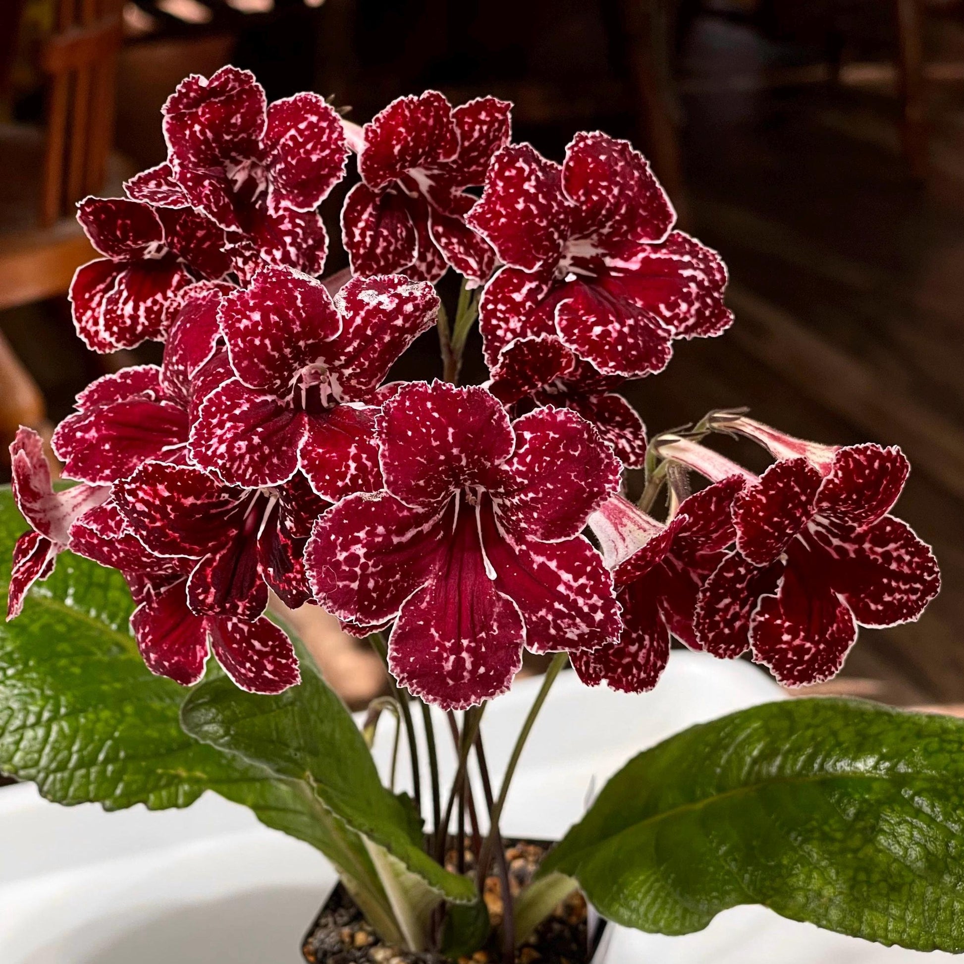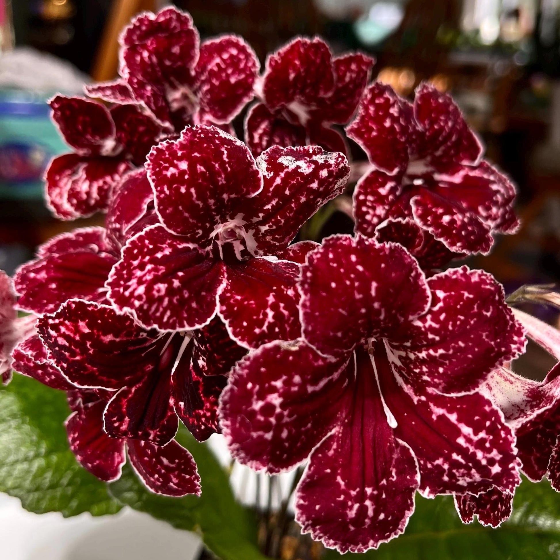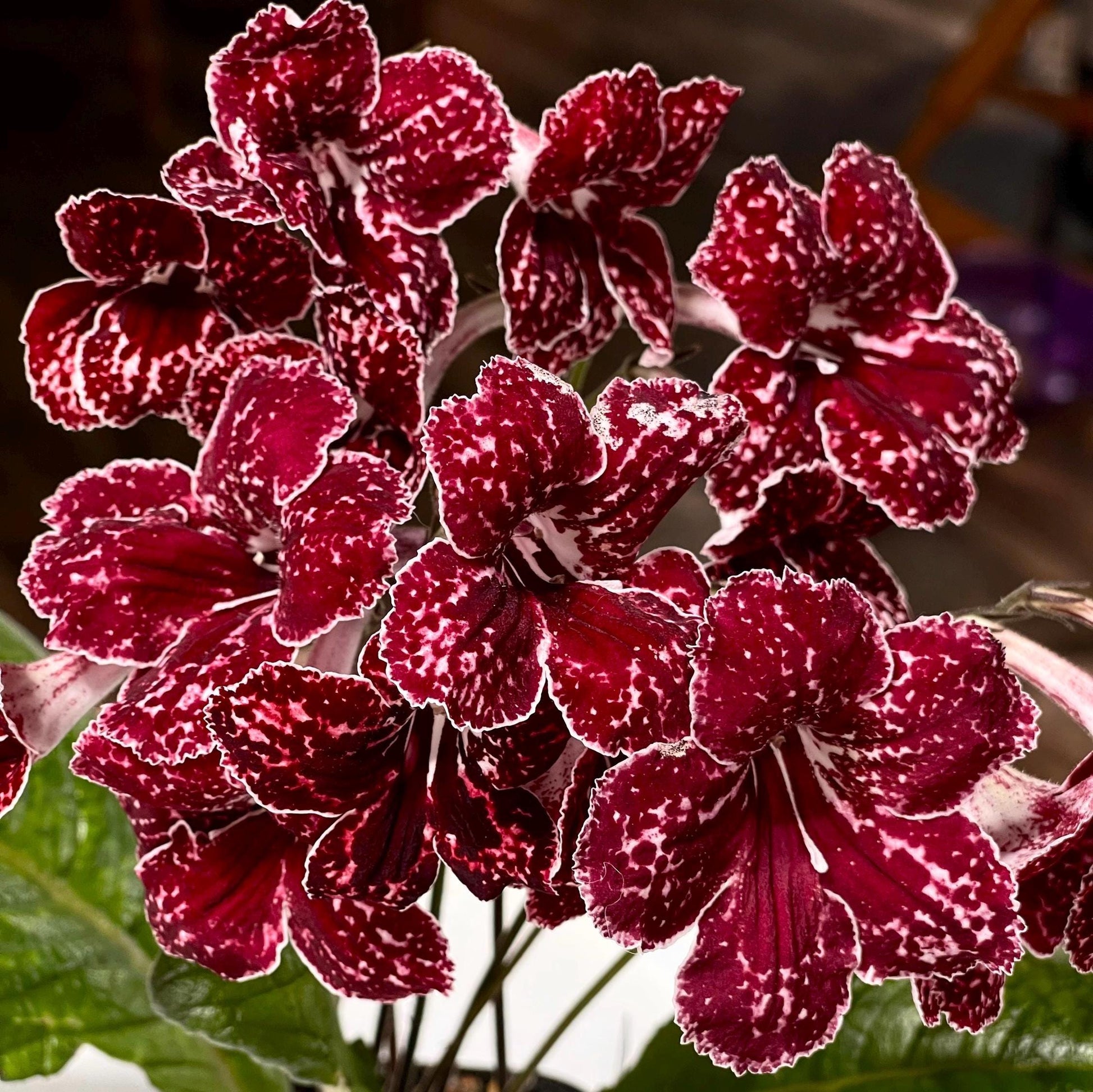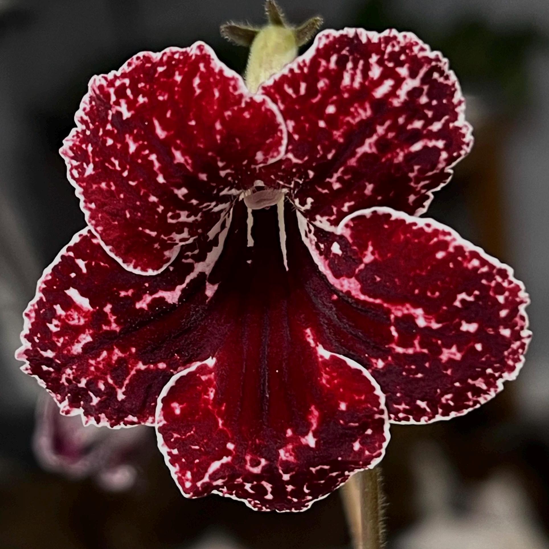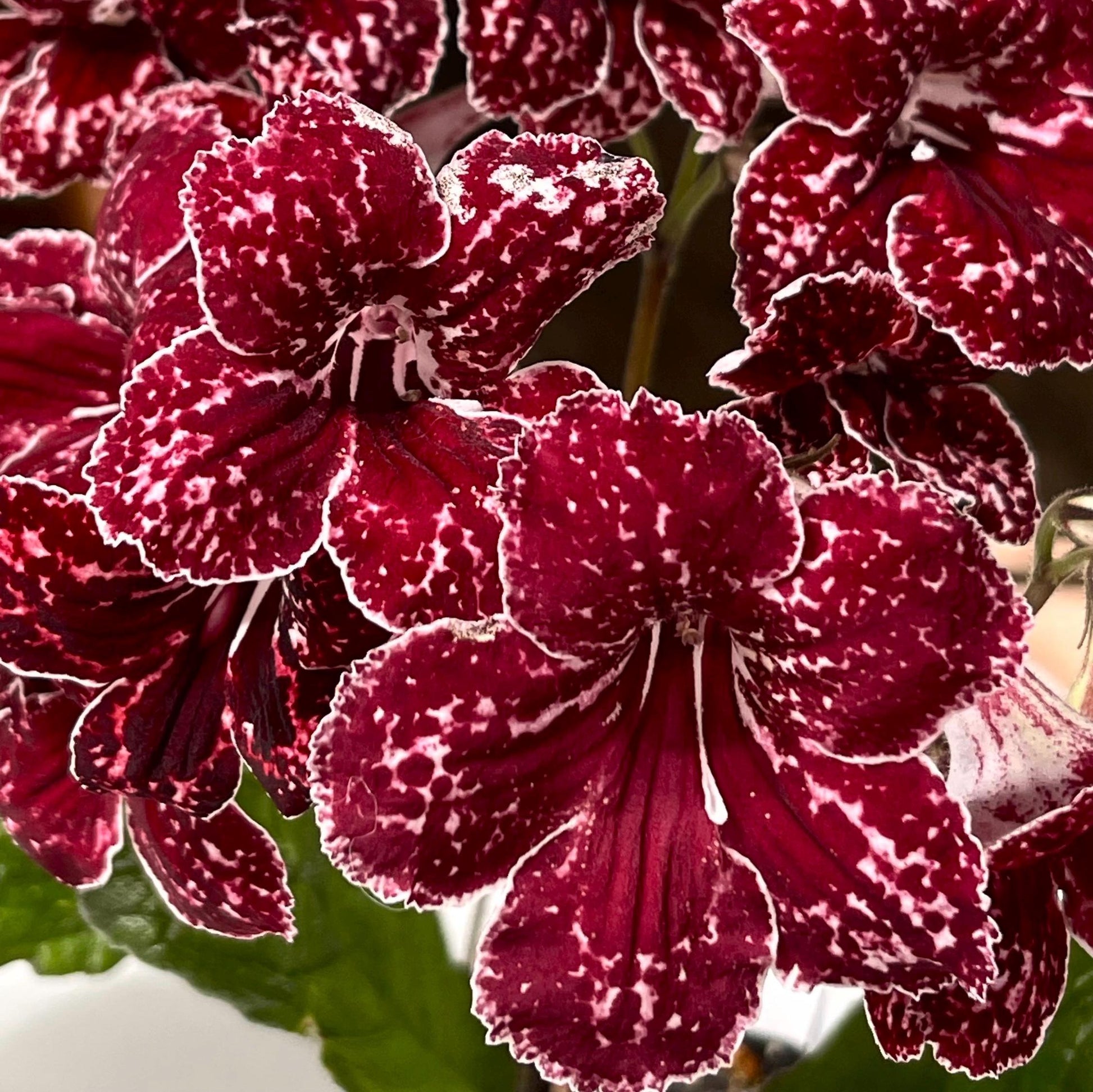BB 1219 is a new introduction from Brandywine Botanica. Flowers are dark velvety red mottled over white. They measure up to 2 inches wide and bear as many as 5 flowers per stem.