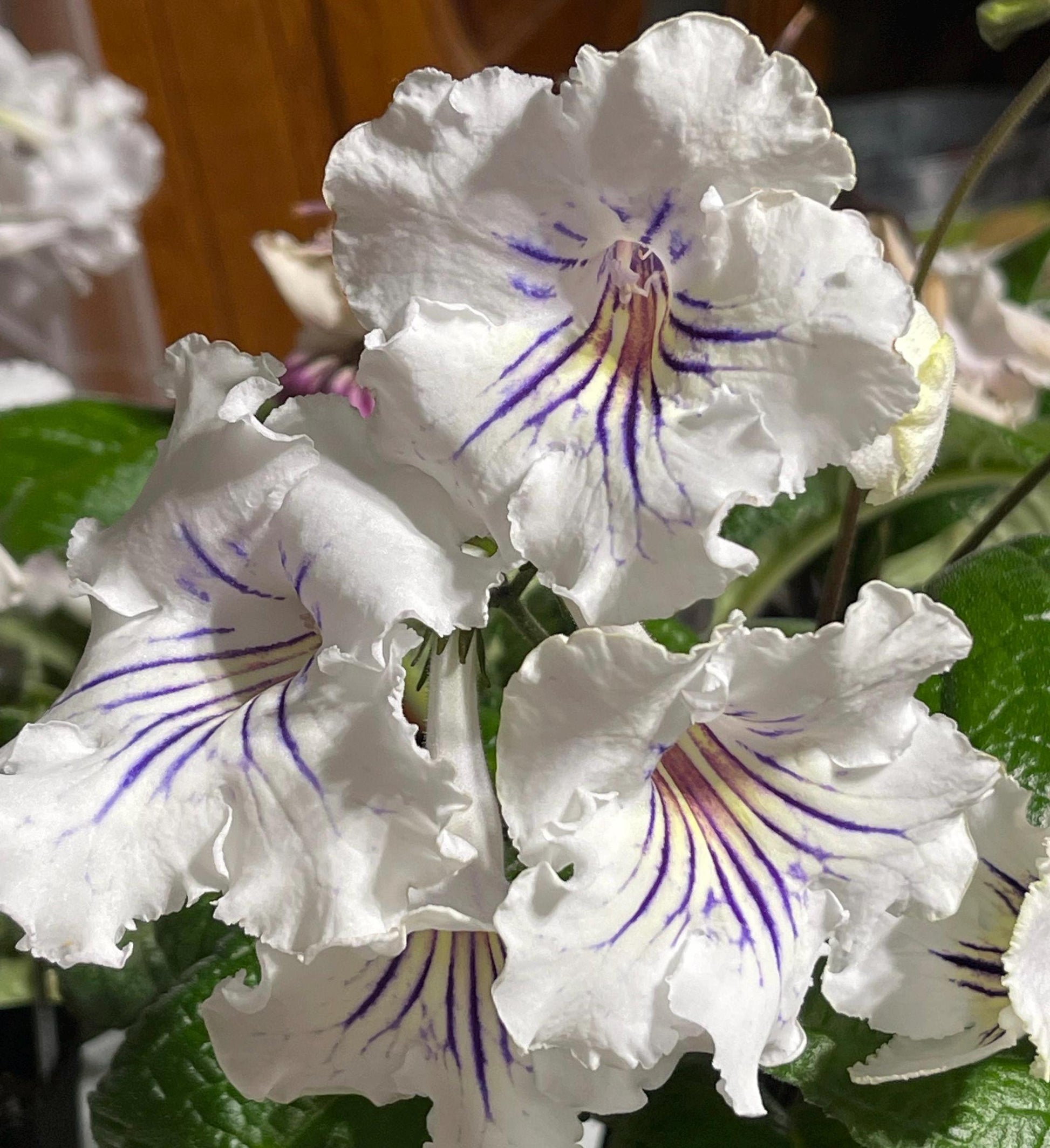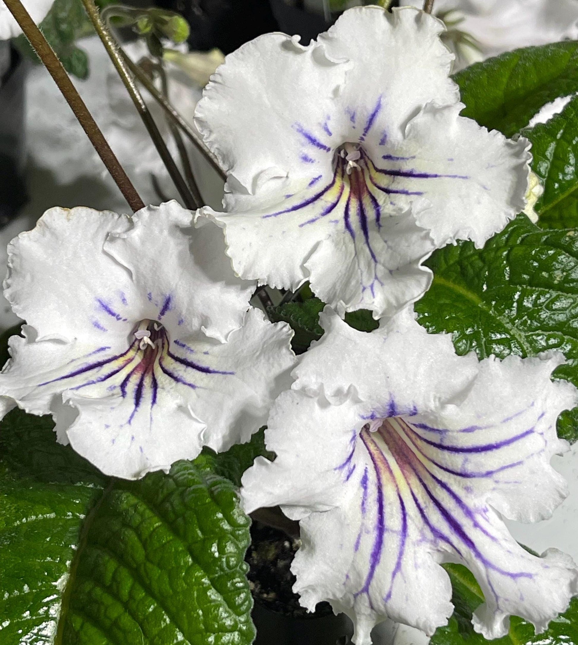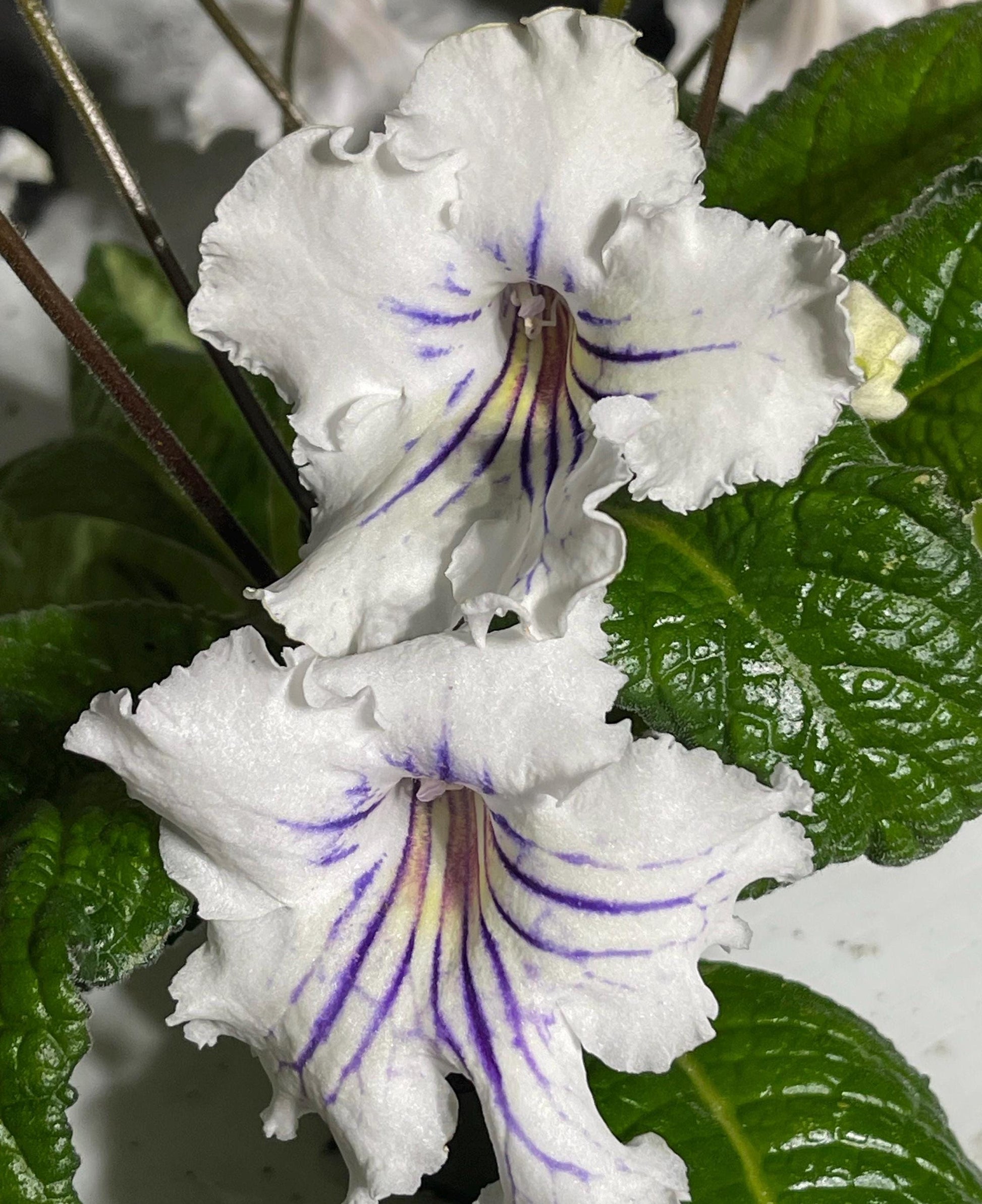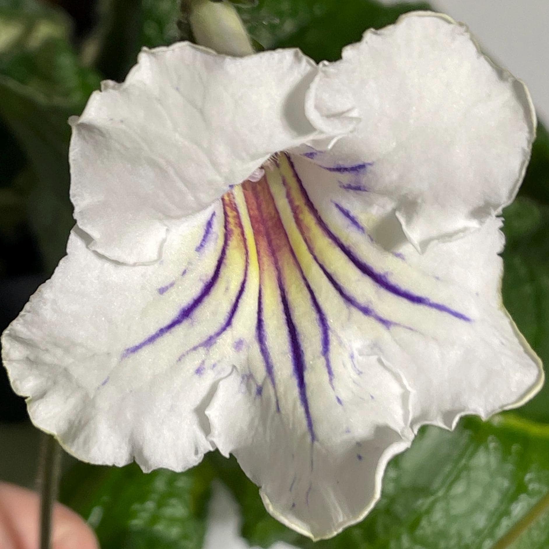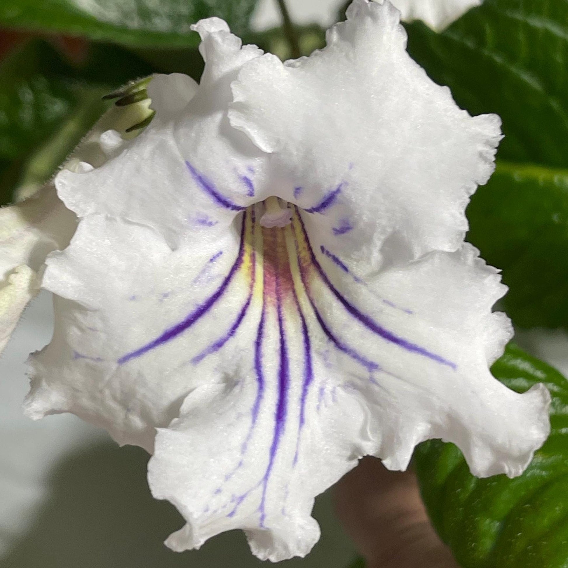BB 1500 is a new introduction from Brandywine Botanica. Beautiful large white flowers up to 4 inches wide. Contrasting purple veins extend out from the small yellow throat. Flowers expand to develop a ruffled edge when fully mature.