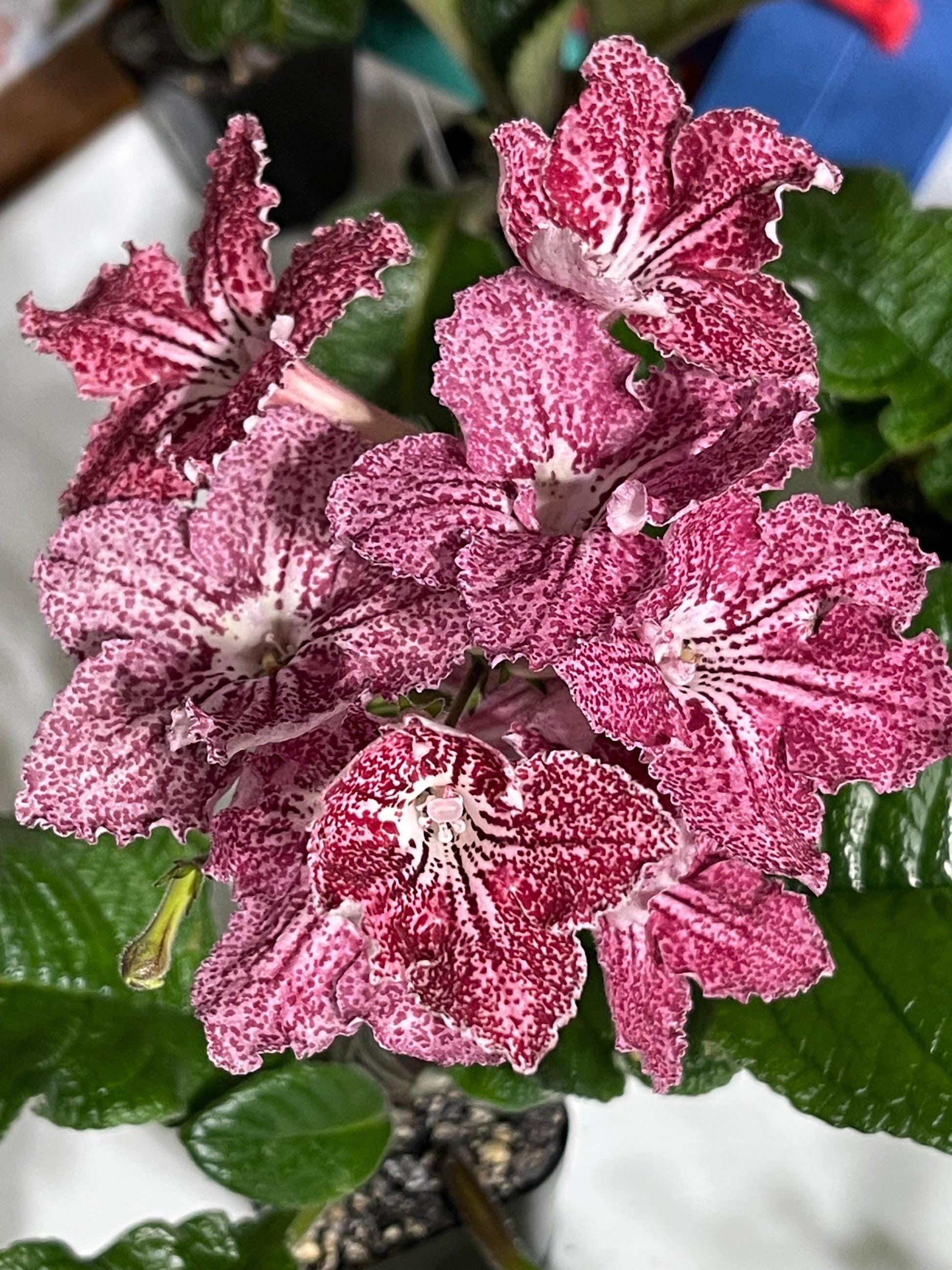 Streptocarpus are close relatives to the African Violet in the Gesneriad family. Plant size can vary with each variety, but generally can reach 12 inches high by 18 inches wide. Leaf size and length varies from plant to plant. Suitable for indoor pots and hanging baskets in an eastern exposure. They can bloom year round with strong growth under fluorescent lighting for 15 hours a day. Use a light, porous potting mix and allow plants to dry down between waterings. Wet soil will cause plants to rot. Feed regularly using a well balanced fertilizer with every watering. Ideal temperature is 65 to 75 degrees with a minimum of 50 degrees. They do not like it too hot.