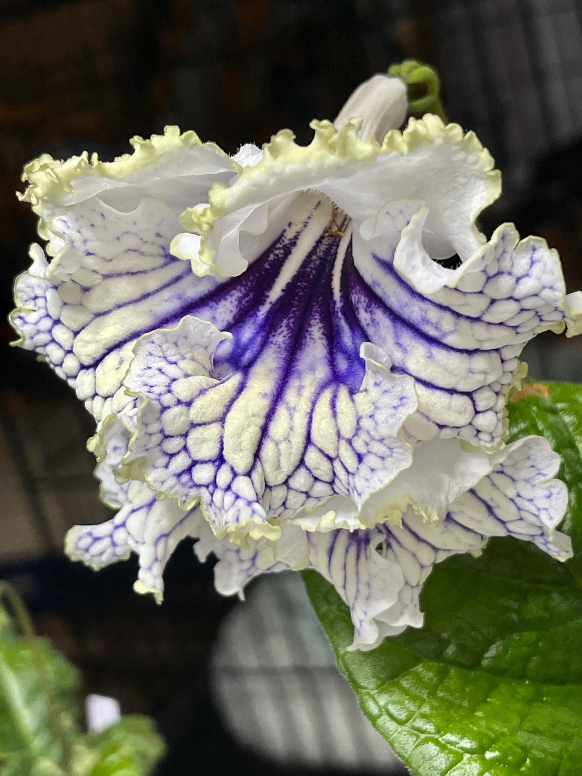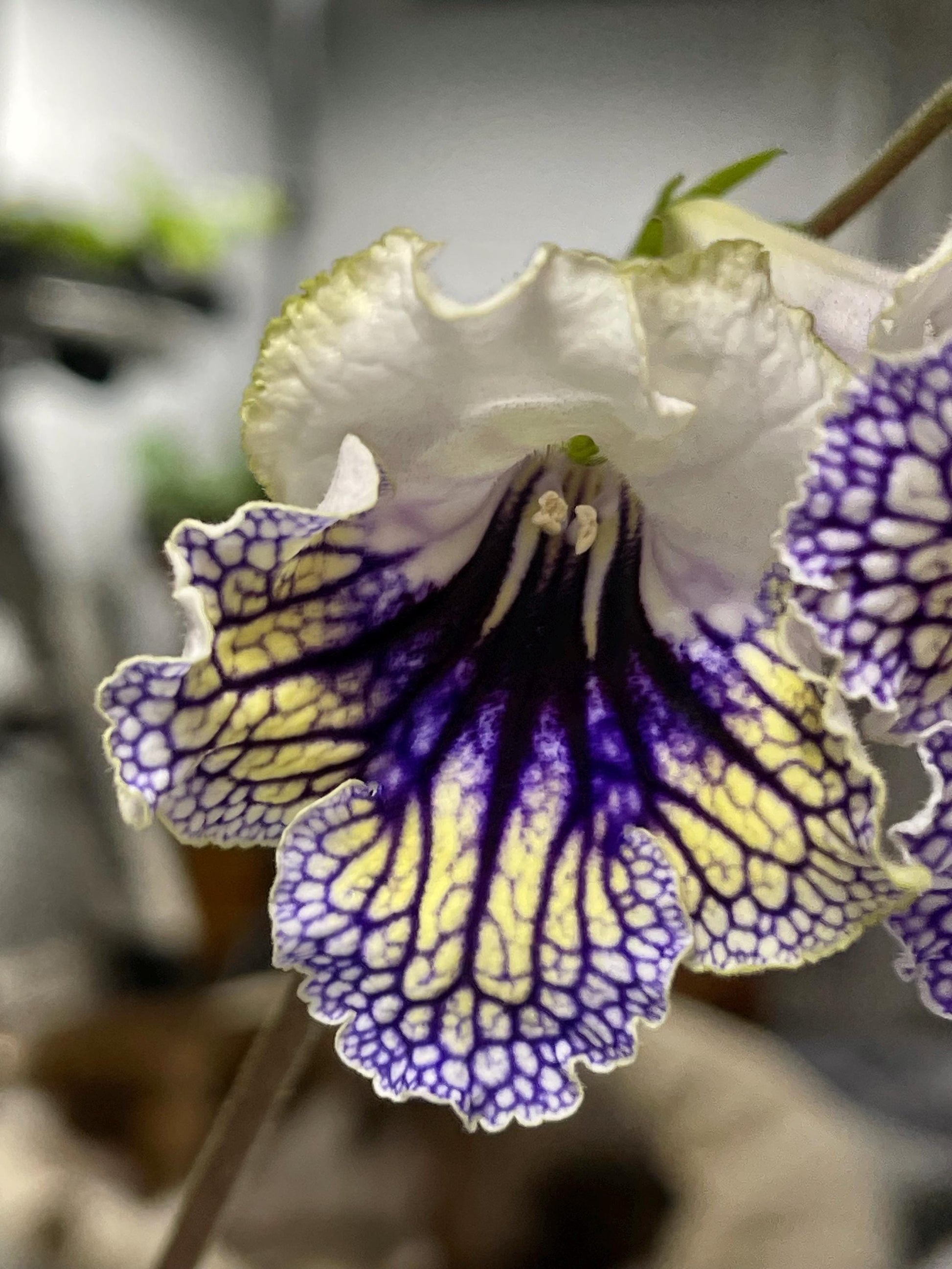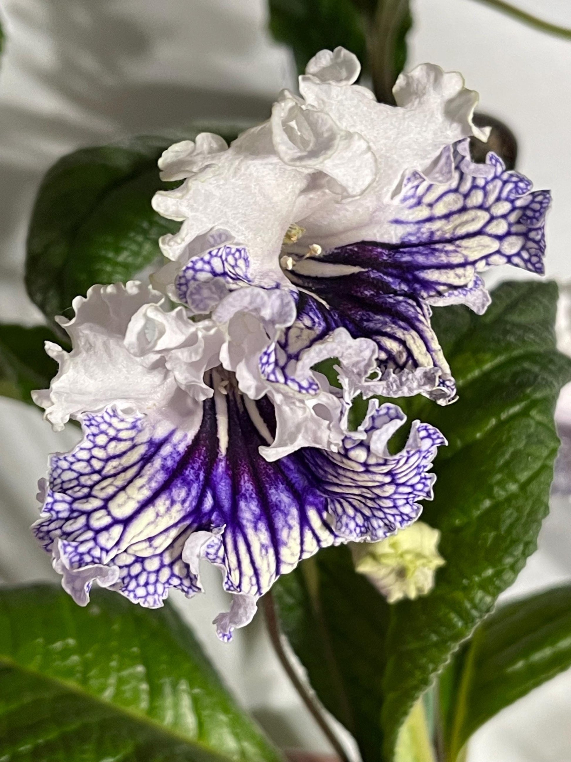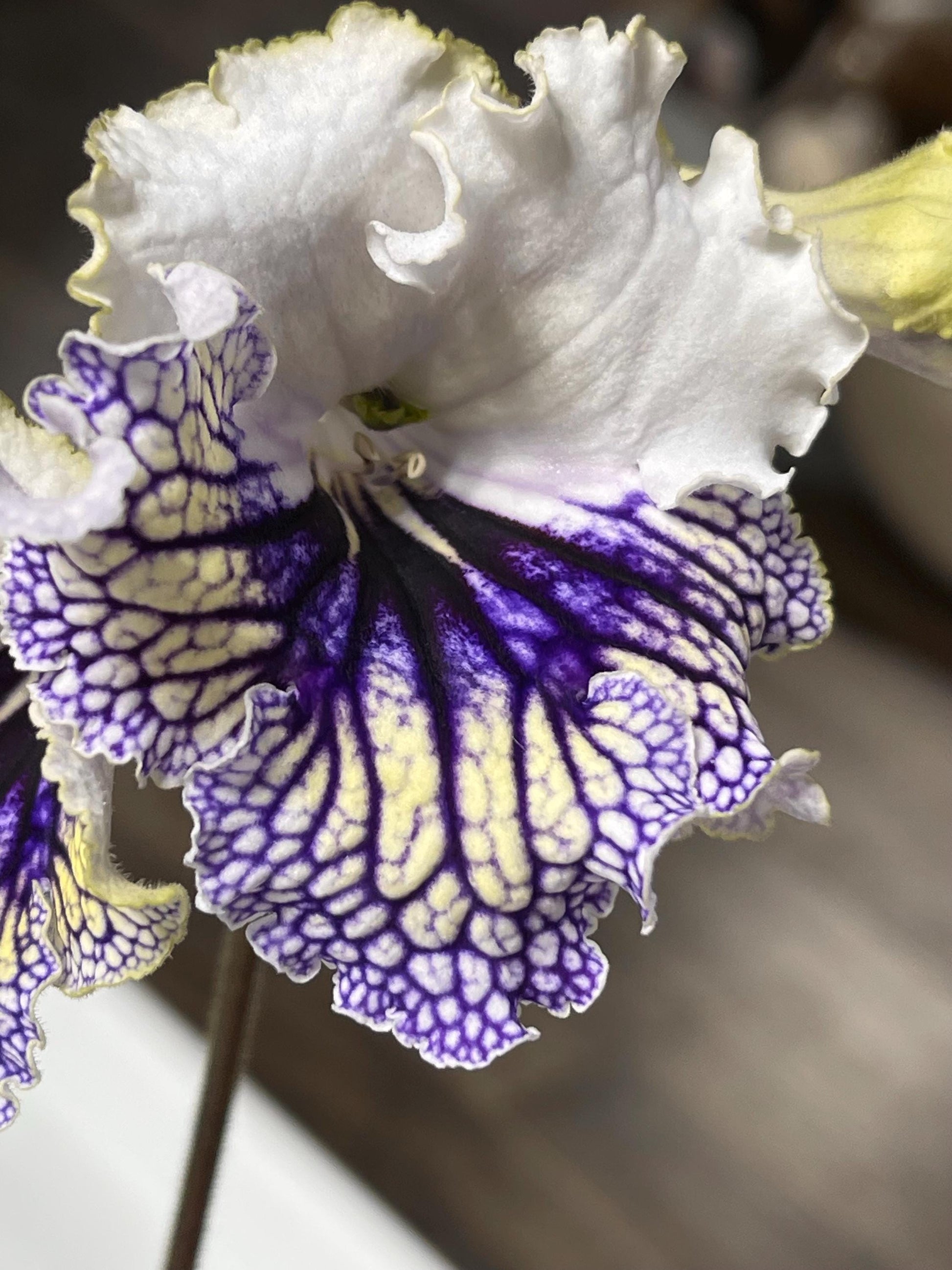 BB 1640 is a new introduction from Brandywine Botanica. White upper lobes, creamy yellow lower lobes heavily netted in purple. Very similar to Butterfalls 1485, but ruffled edges are tinted green as they are unfolding. Yellow on falls lightens to near white as blooms age.