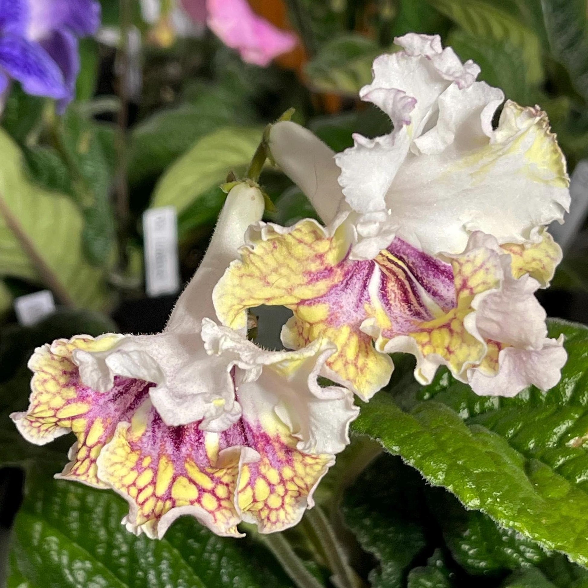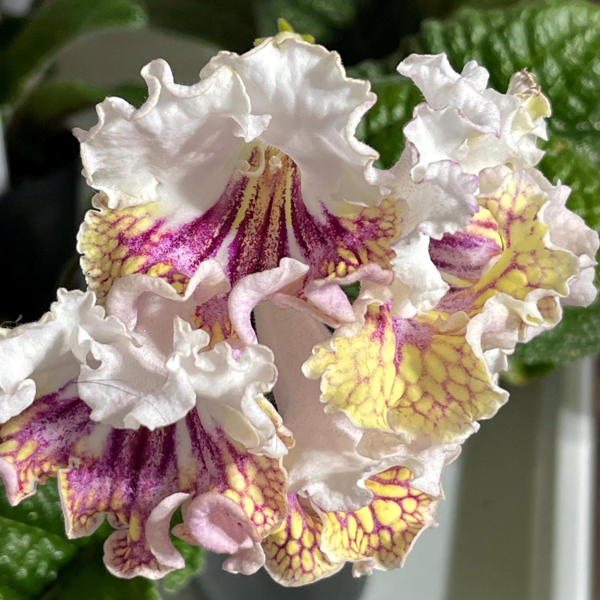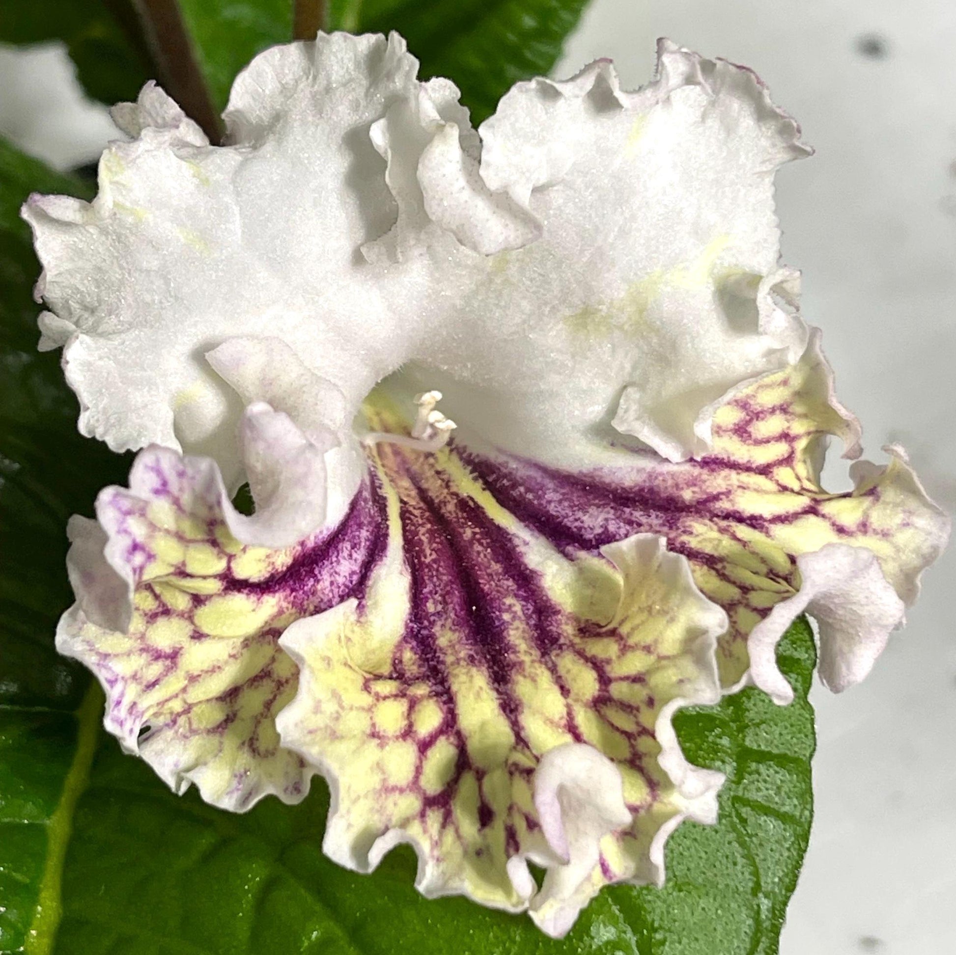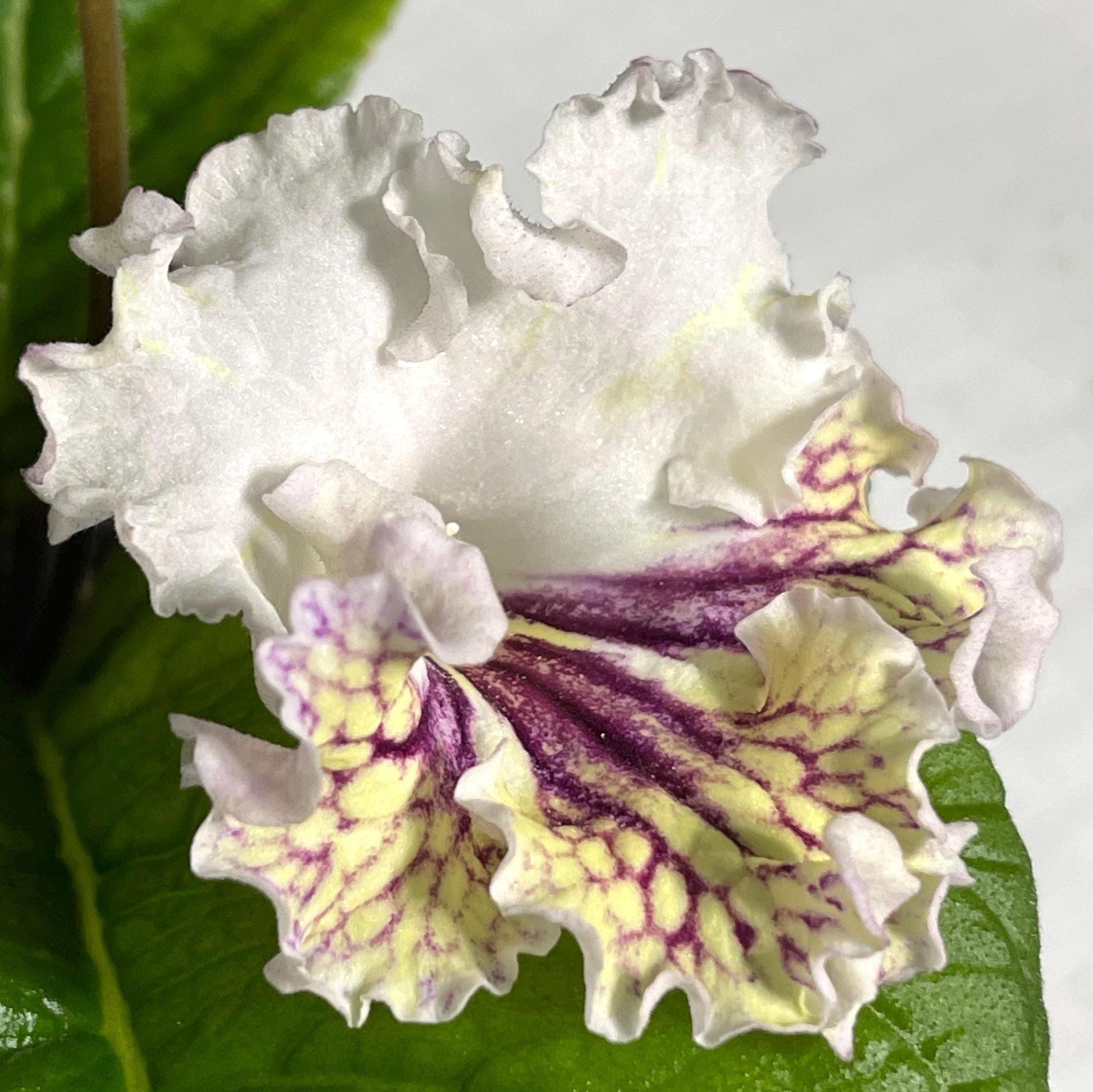 BB 1771 is a new introduction from Brandywine Botanica. White upper lobes, Light yellow lower lobes with magenta netting. Very ruffled edges. Color can be variable with age of blooms. A select hybrid from DEM Champagne.