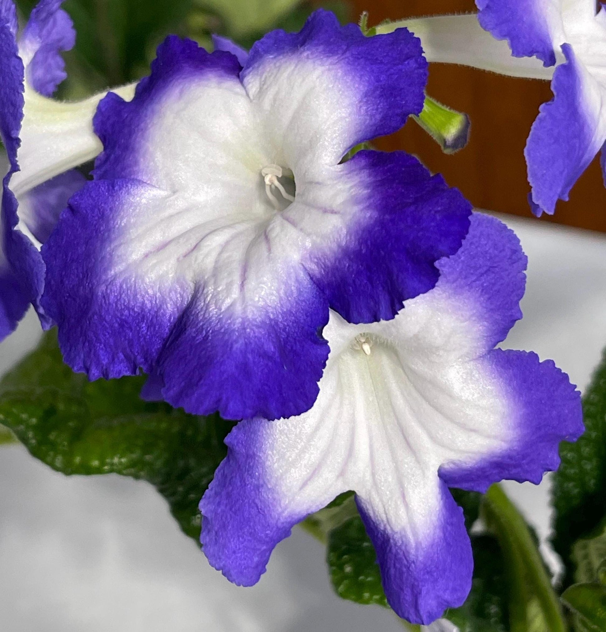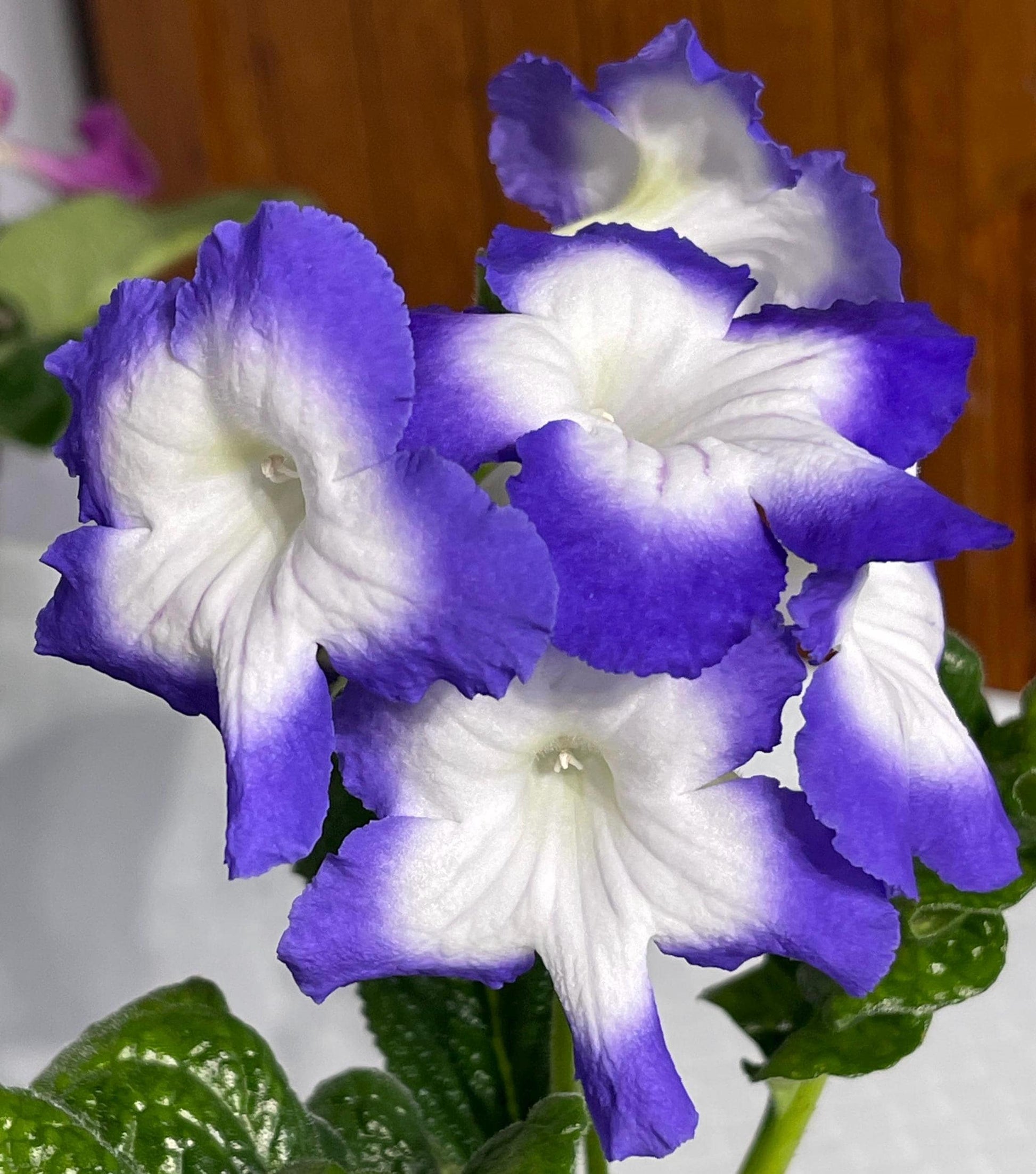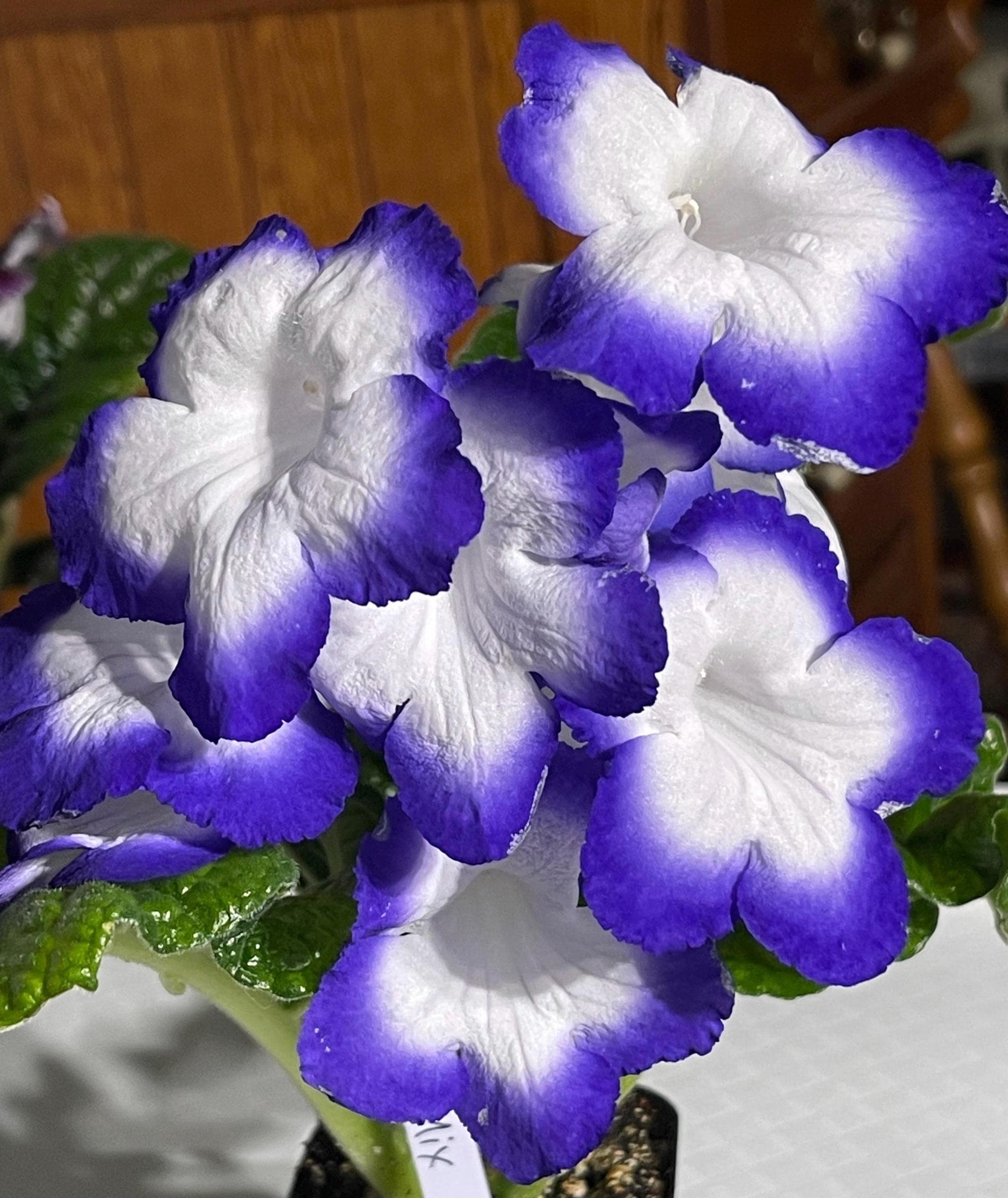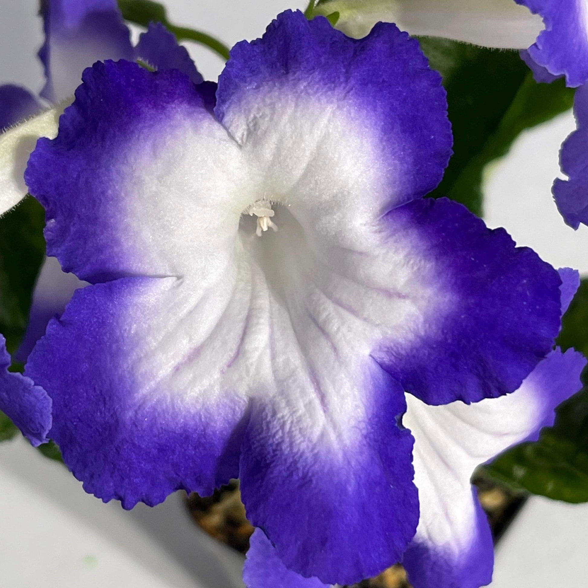 BB 3135 is a new introduction from Brandywine Botanica. Flowers are white with broad purple rims. They measure up to 2.75 inches wide with up to 4 buds per stem. Large upright foliage is dark, glossy green.