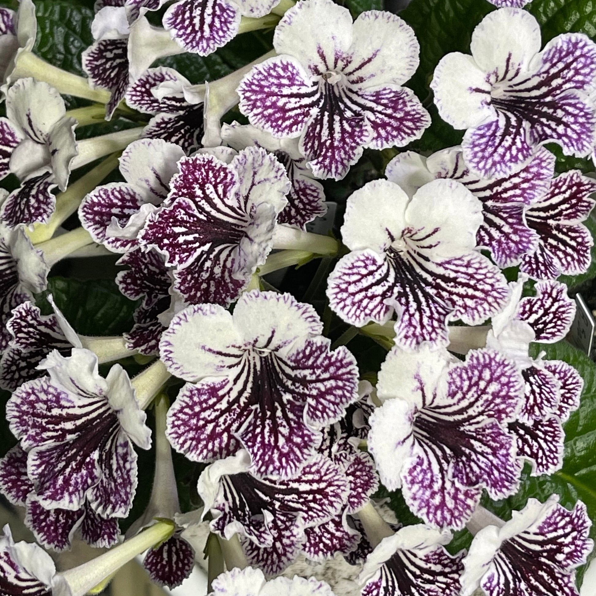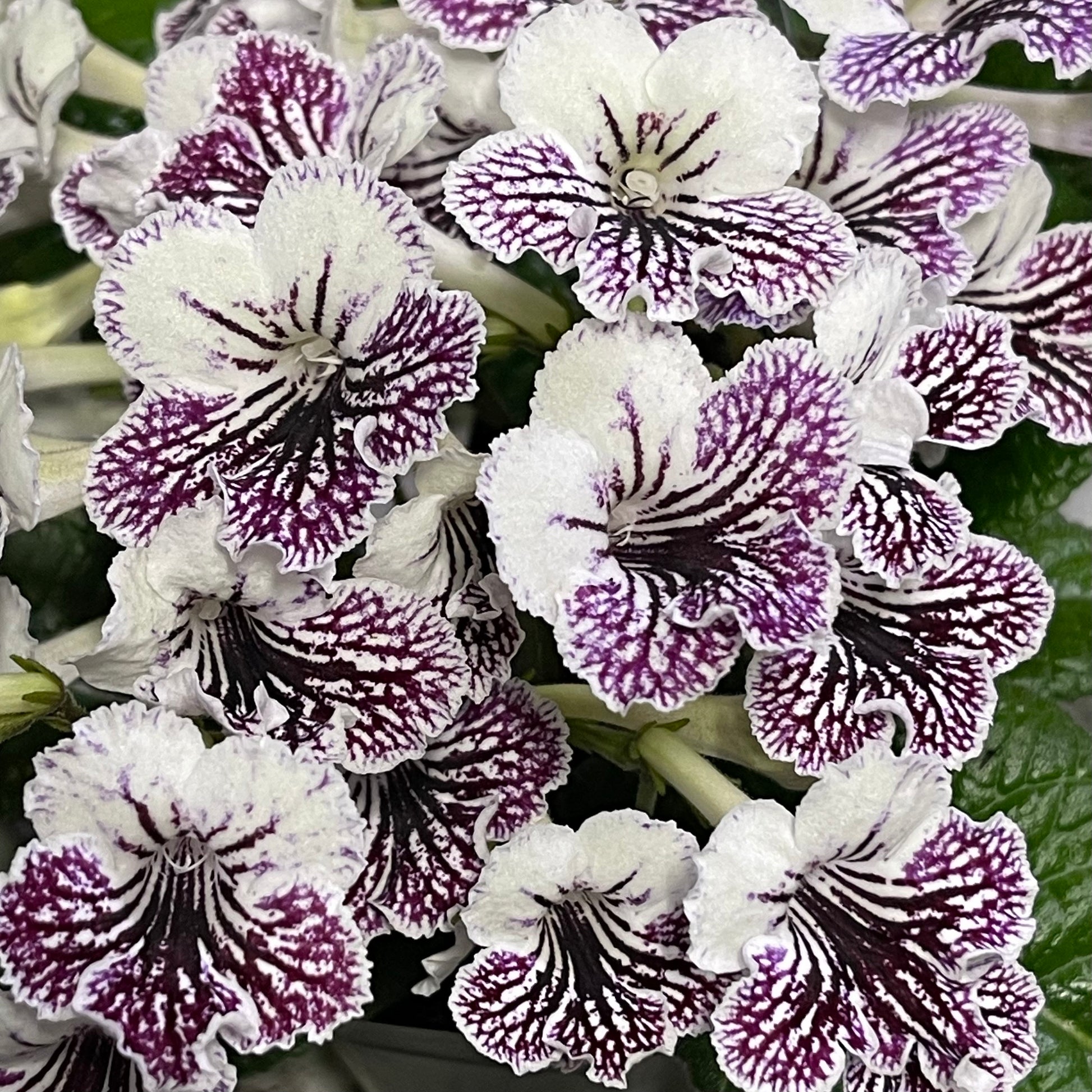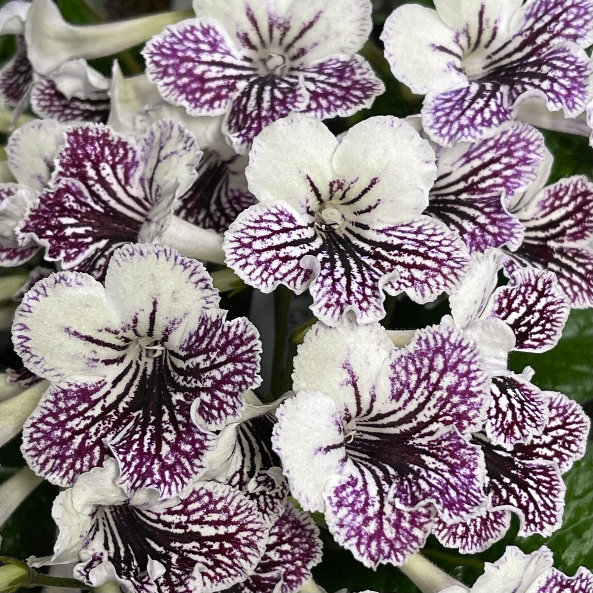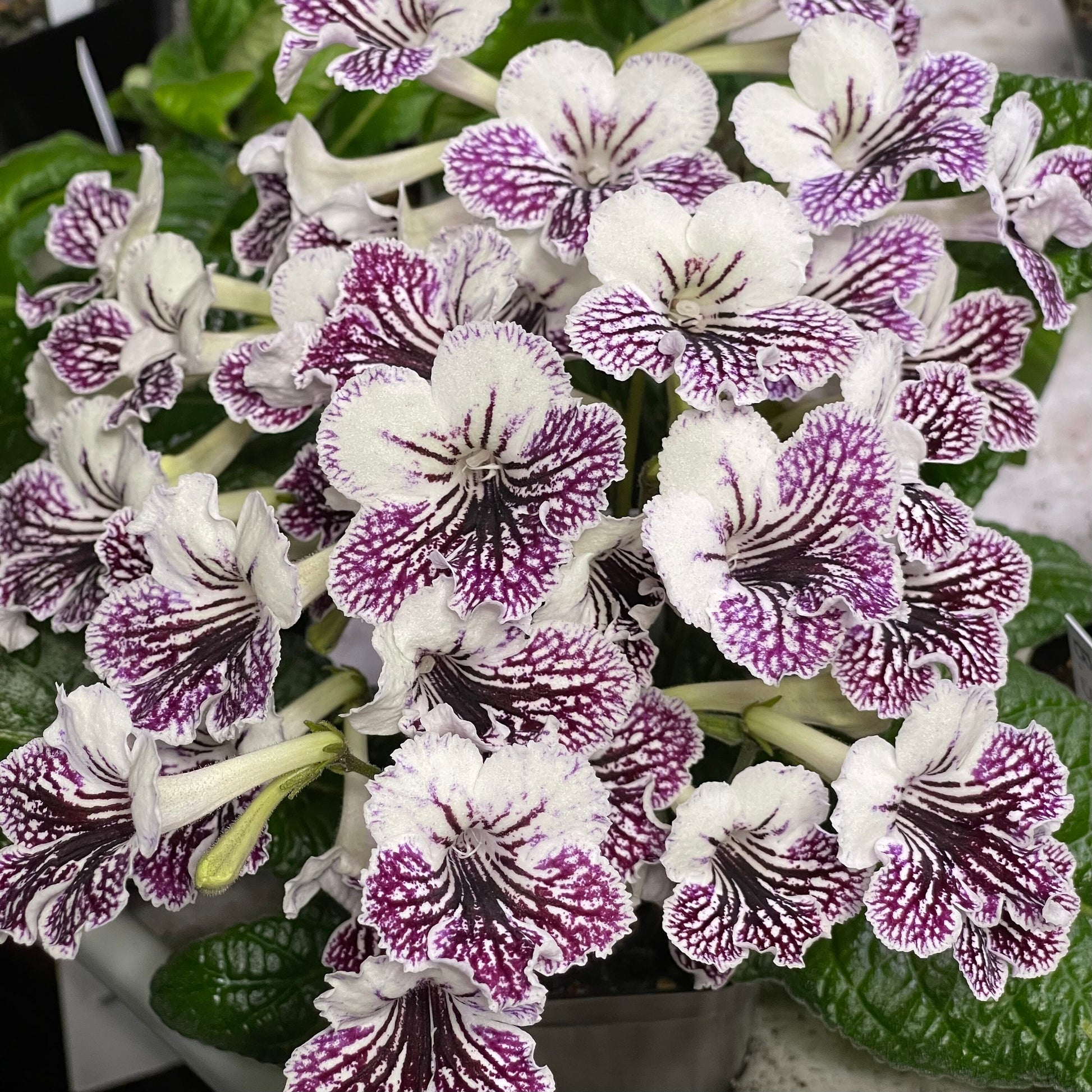 Bristol's Geode - Beautiful white blooms with deep purple netting on lower lobes. Well behaved medium green foliage. Great bloomer and easy grower.