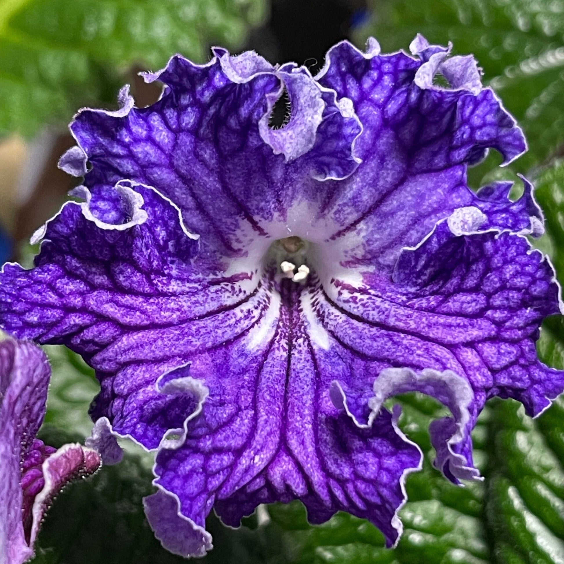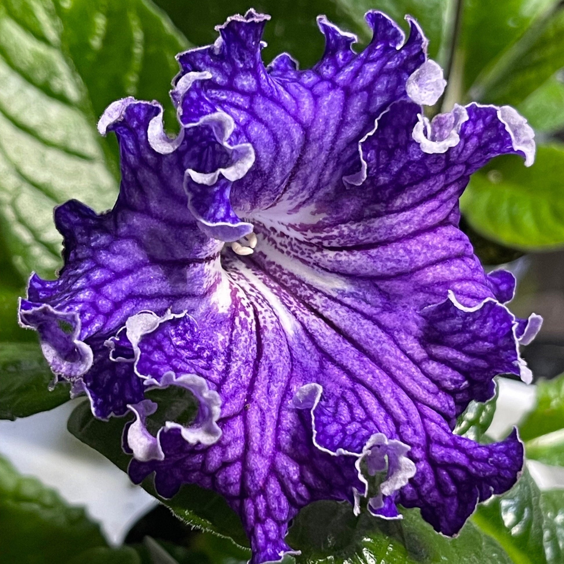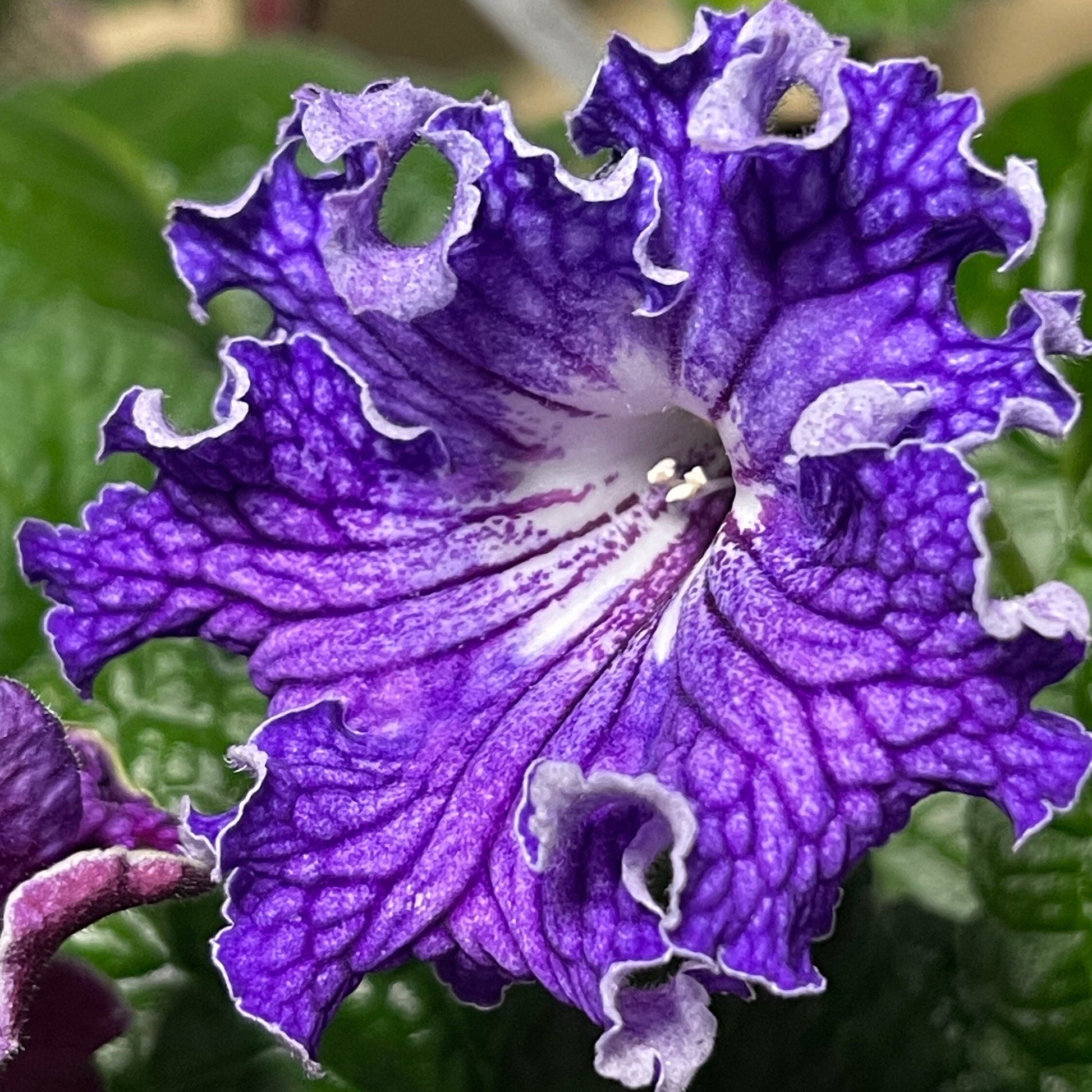 Dem 144 Hvylla, bred by Dmitry Demchenko, Ukraine, has large frilly purple flowers with darker burgundy veins and a white throat. Gorgeous blooms!