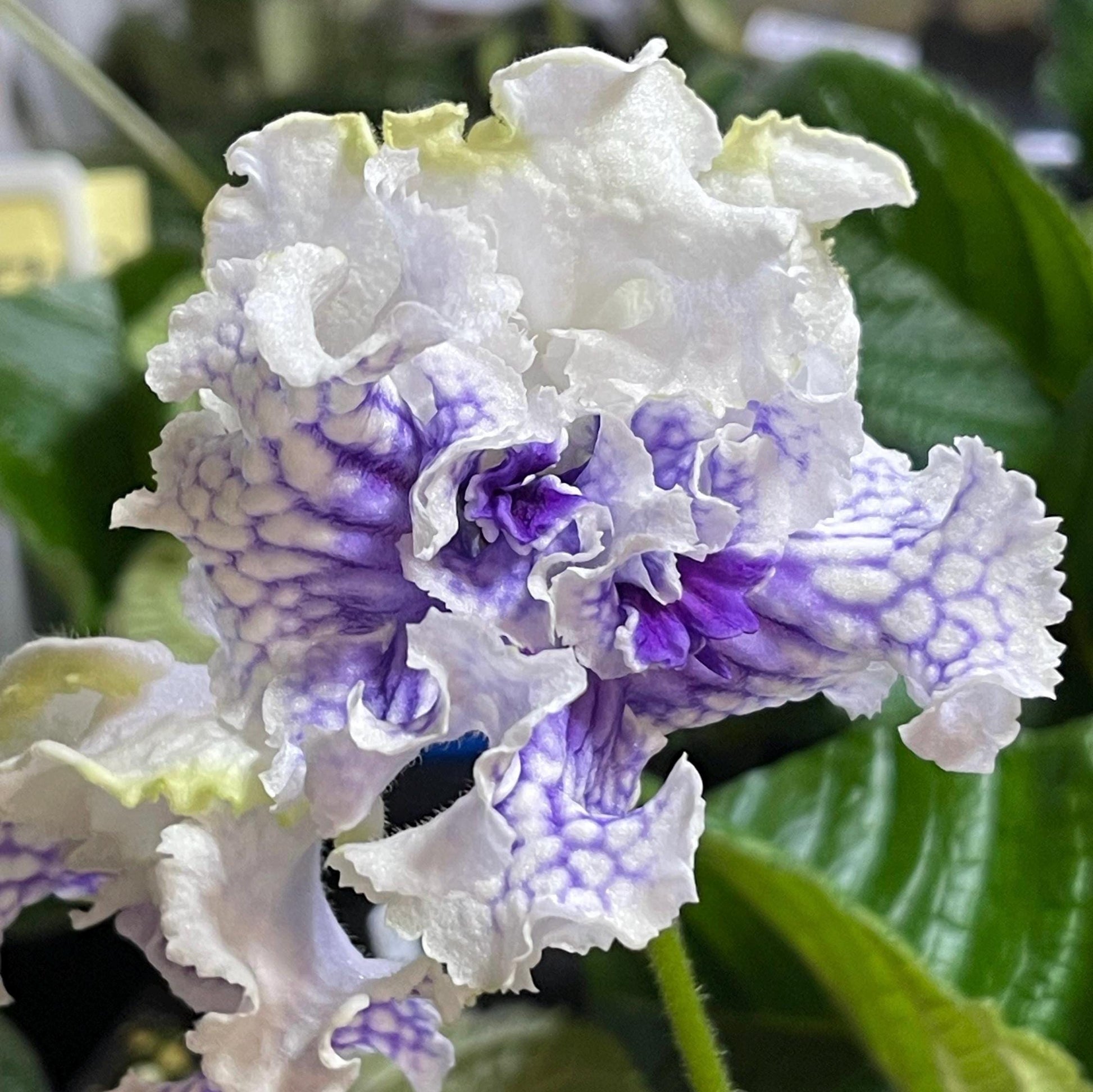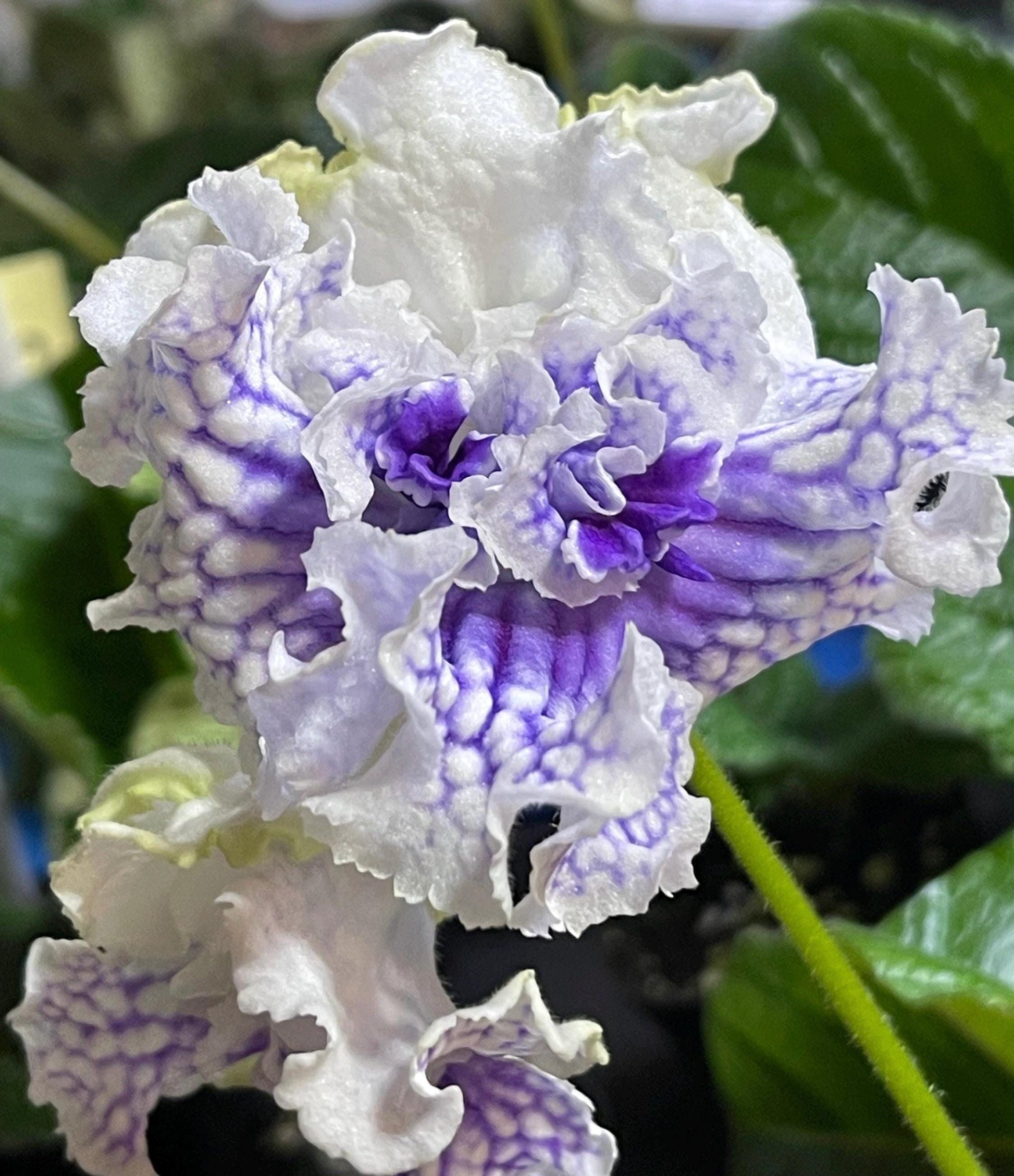 Streptocarpus DS Poseidon has white fully double flowers with contrasting purple netting.