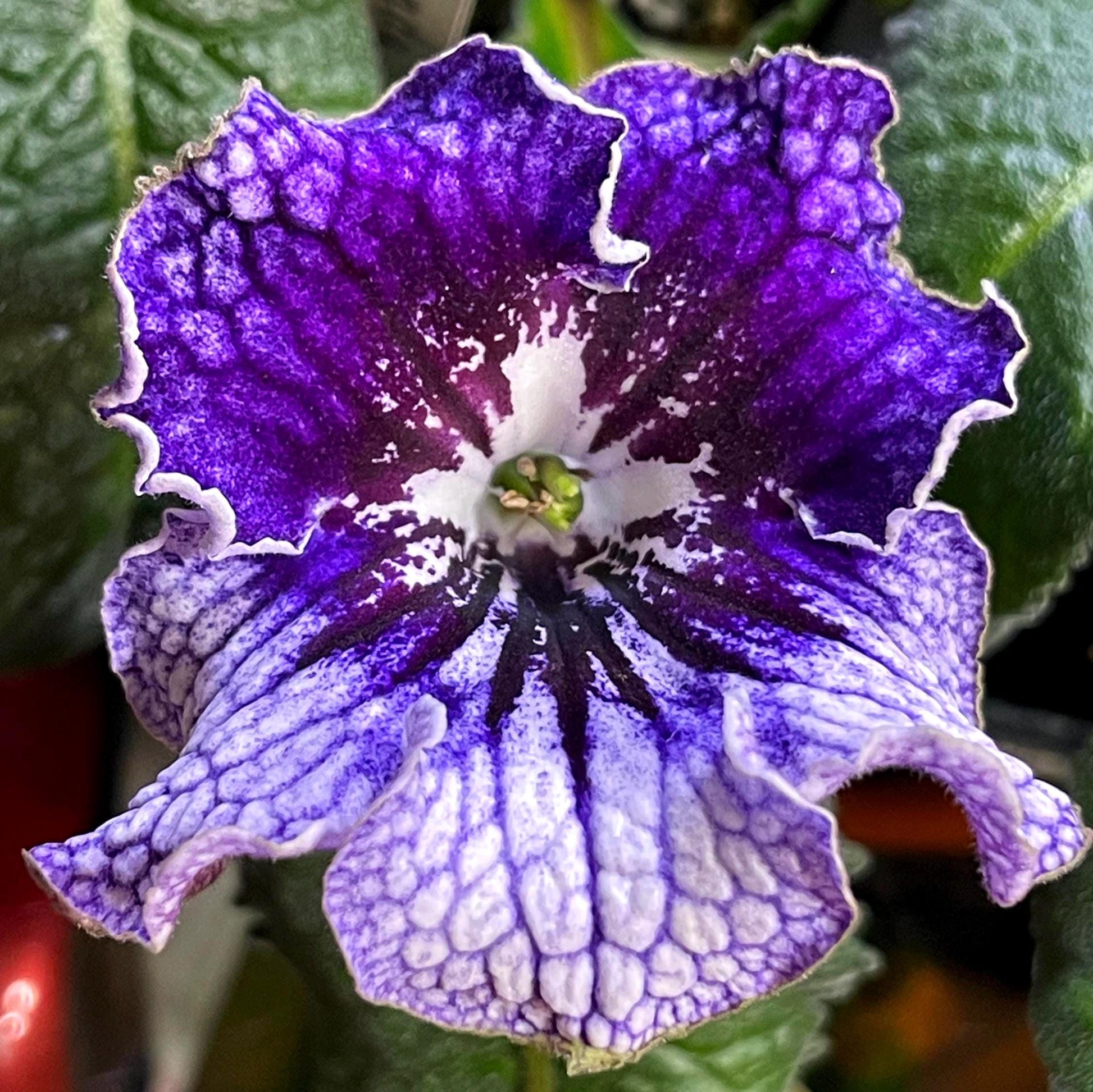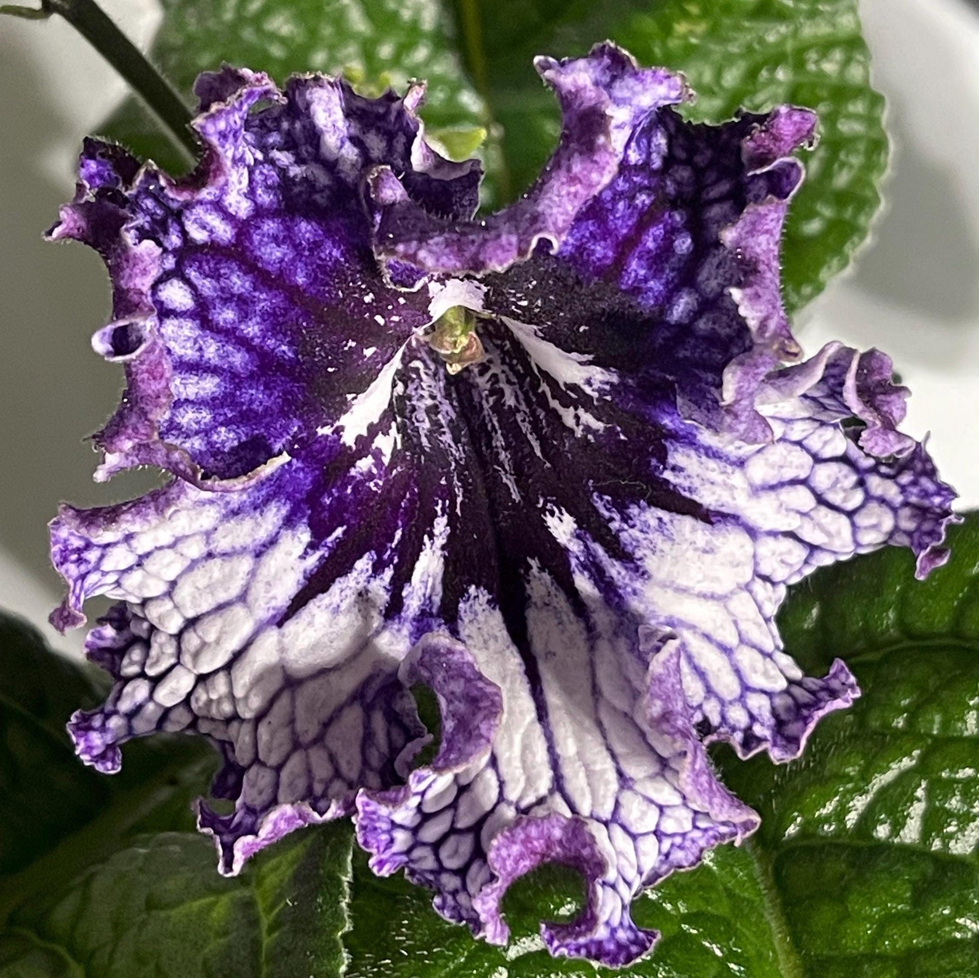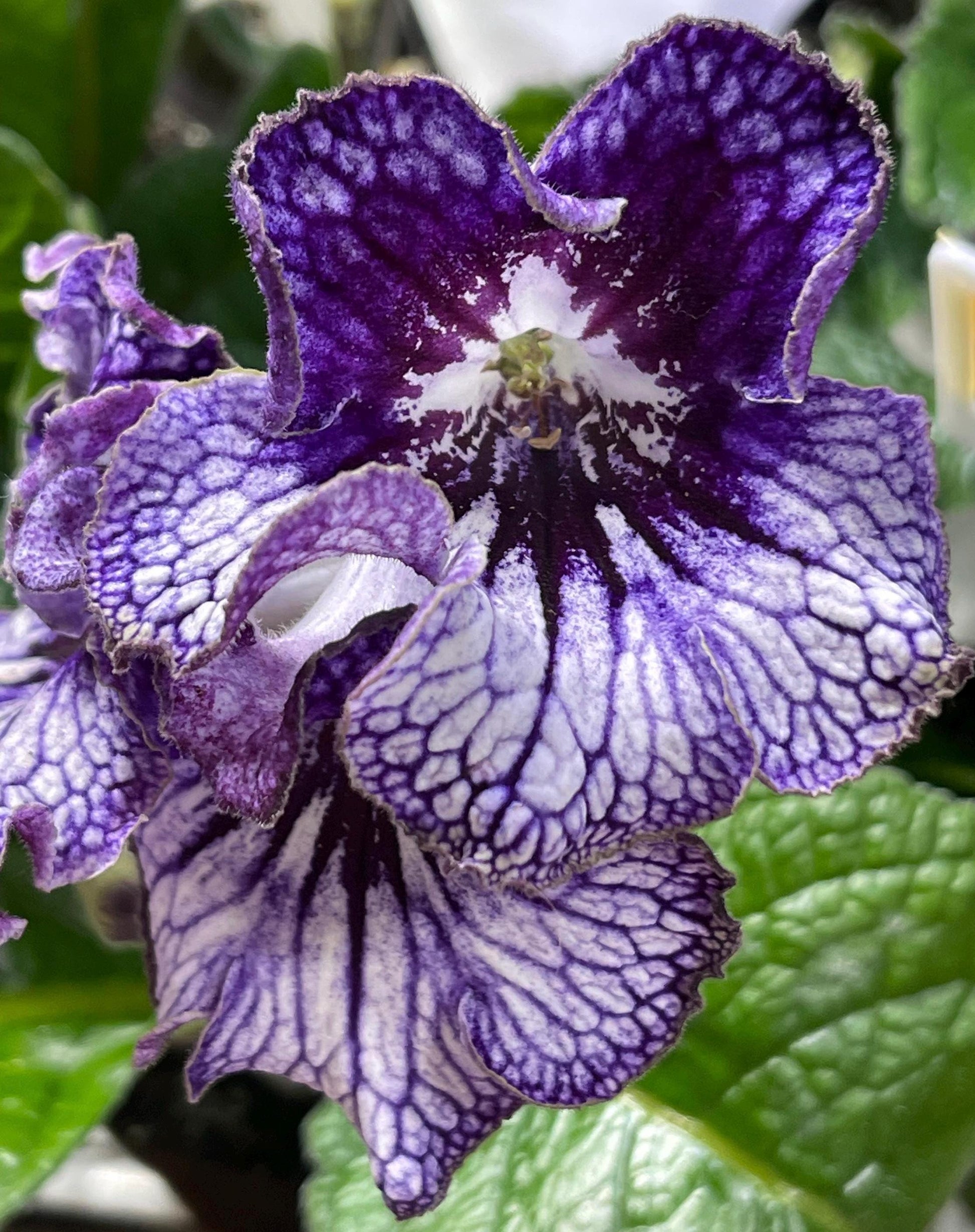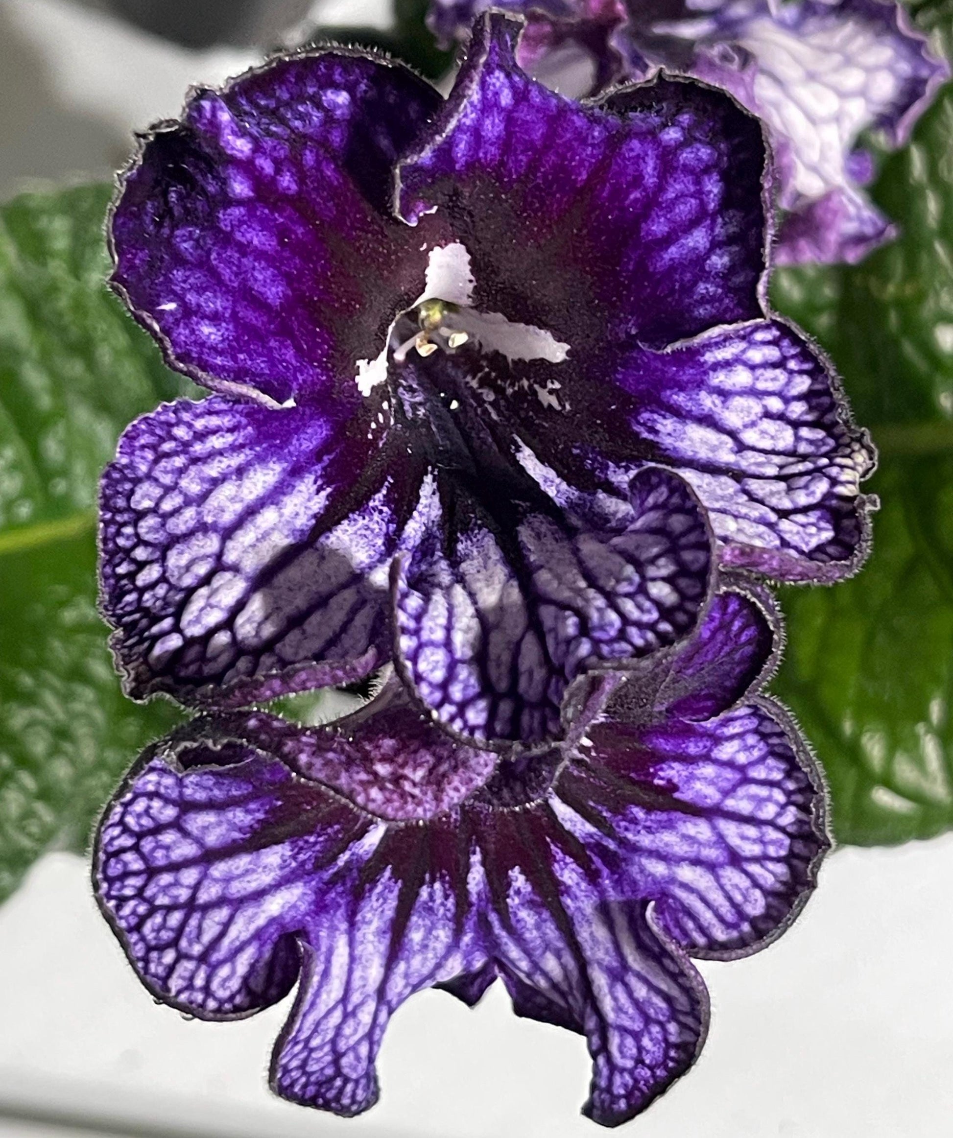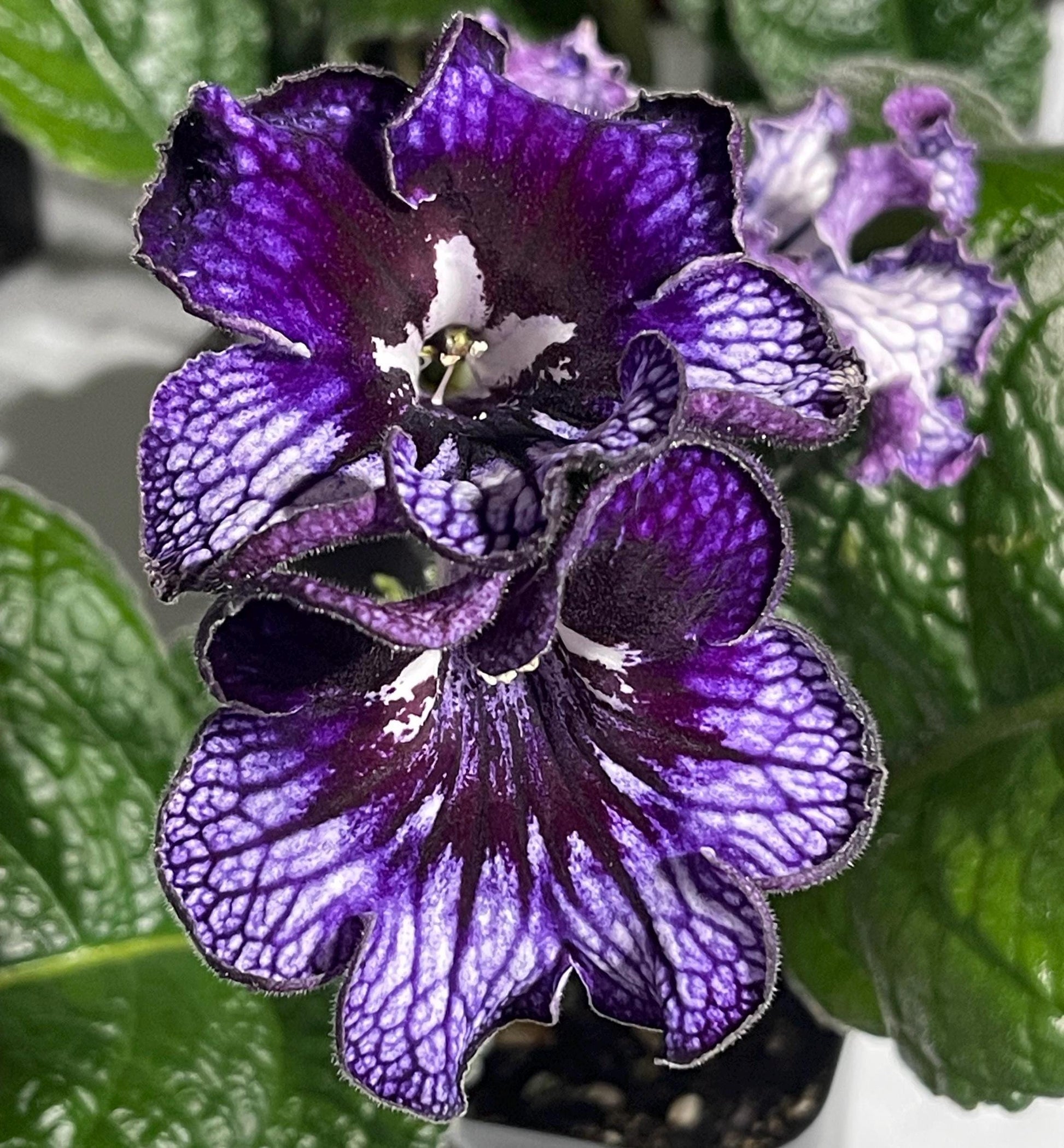 Streptocarpus OD Shavitzer is a Ukrainian hybrid bred by Nikolai Stoyanov in Odessa. It has white lower lobes with heavy purple netting and purple upper lobes with darker veining. Flowers get very frilly when mature.