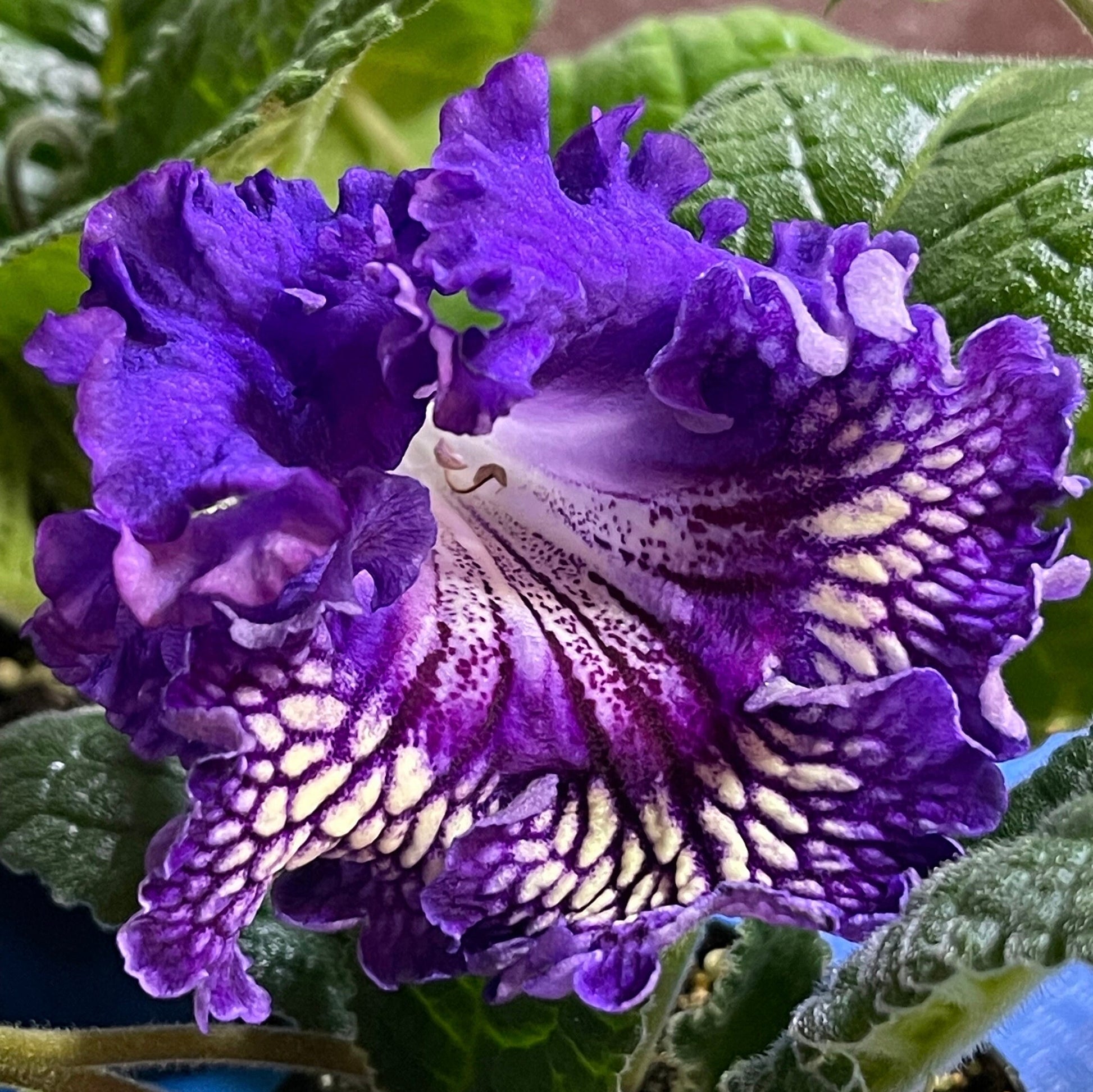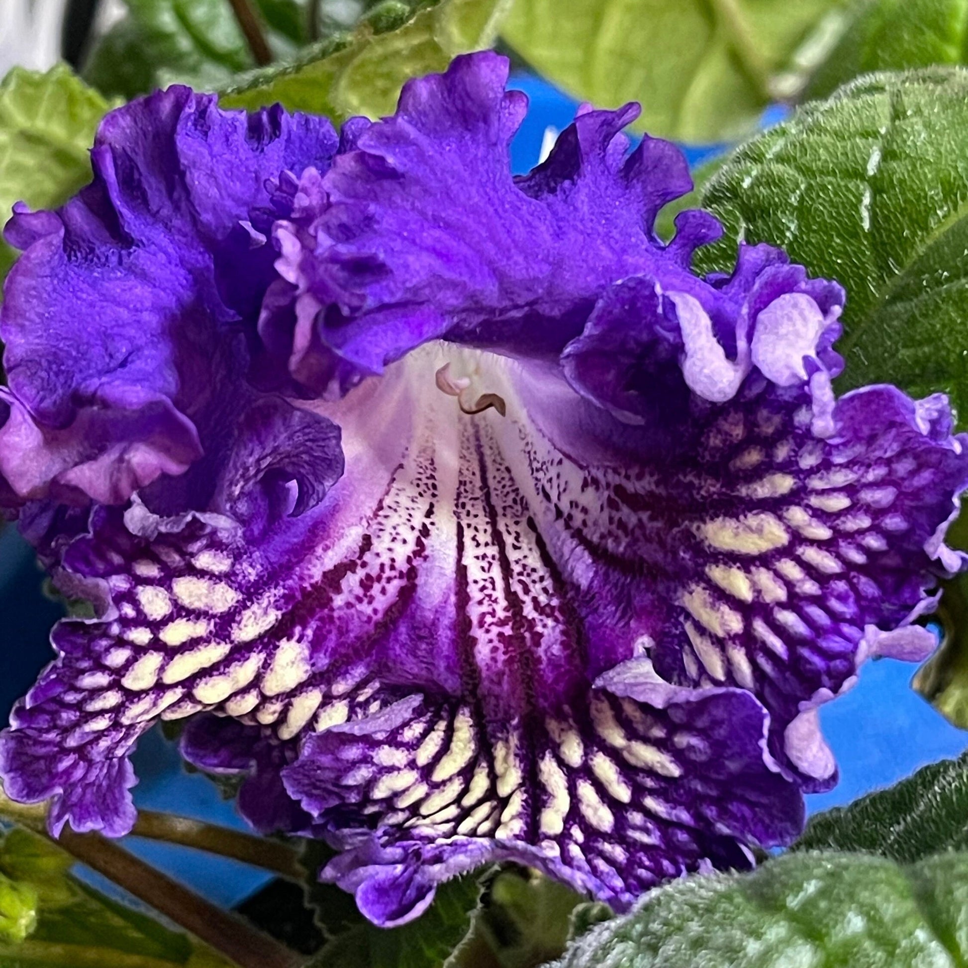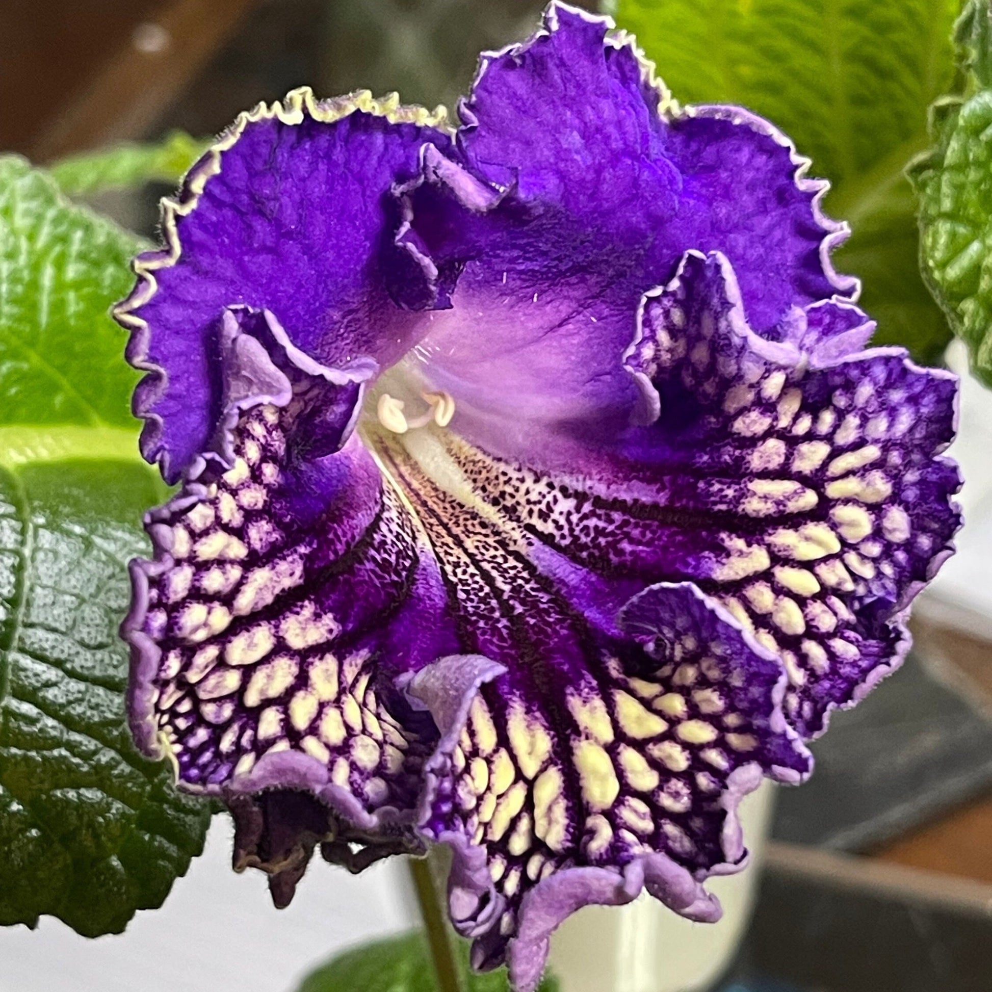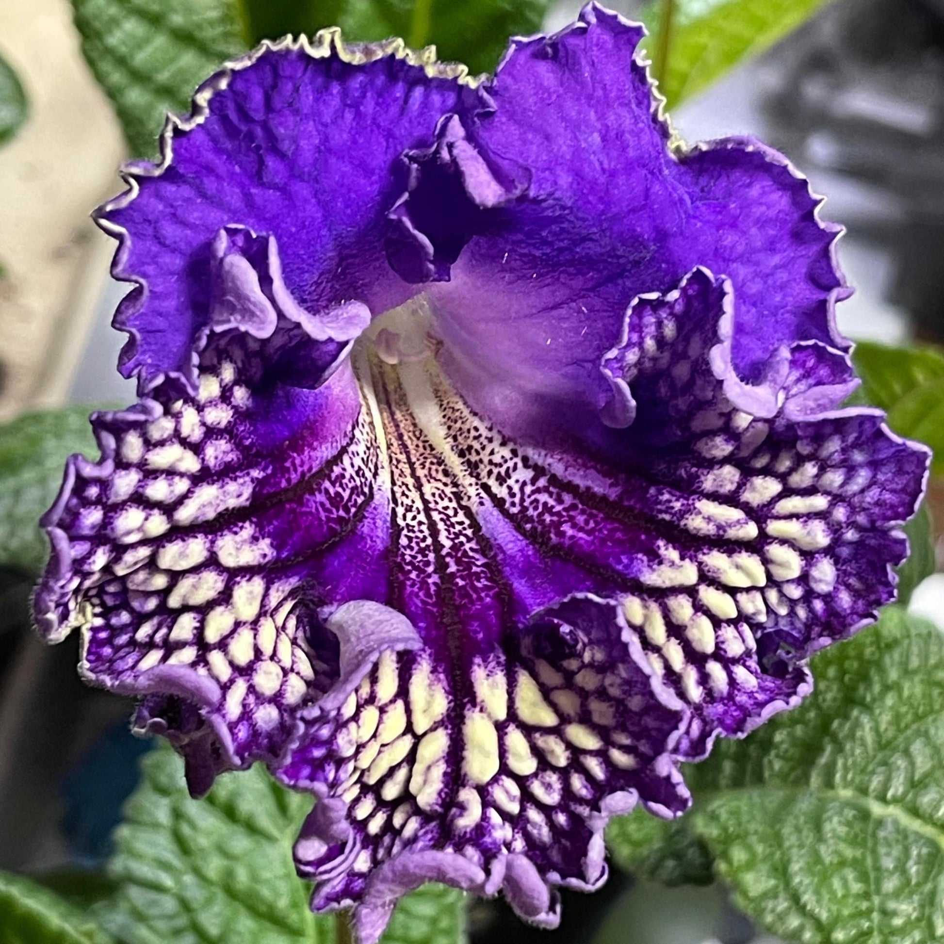 Streptocarpus PK Rand, bred by Piotr Kleschynski, exhibits large frilly flowers with purple upper lobes and yellow lower lobes with dark purple netting.