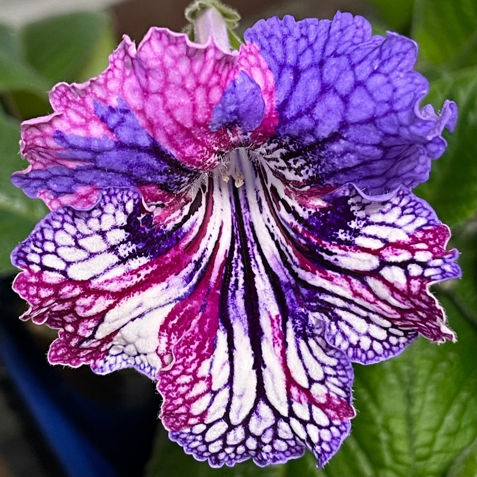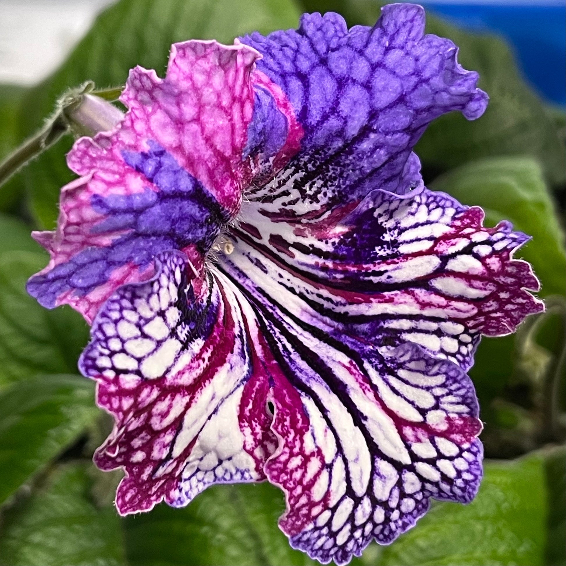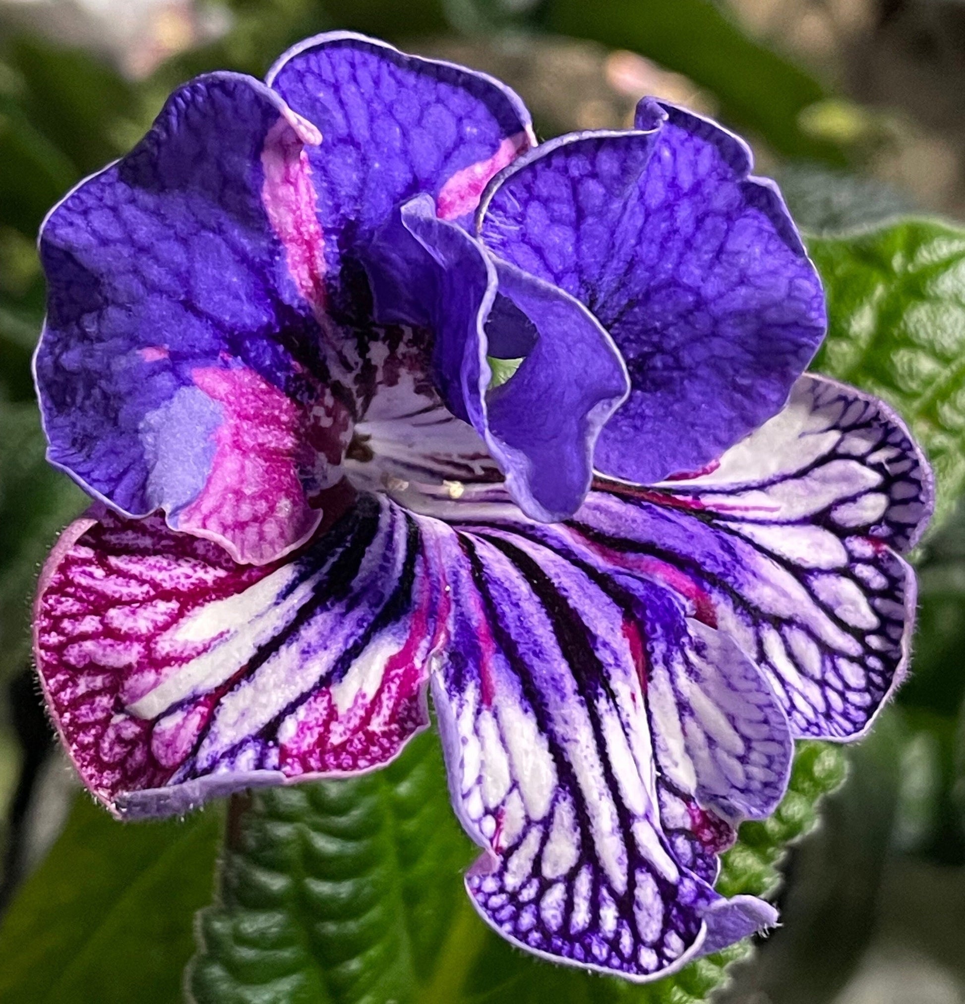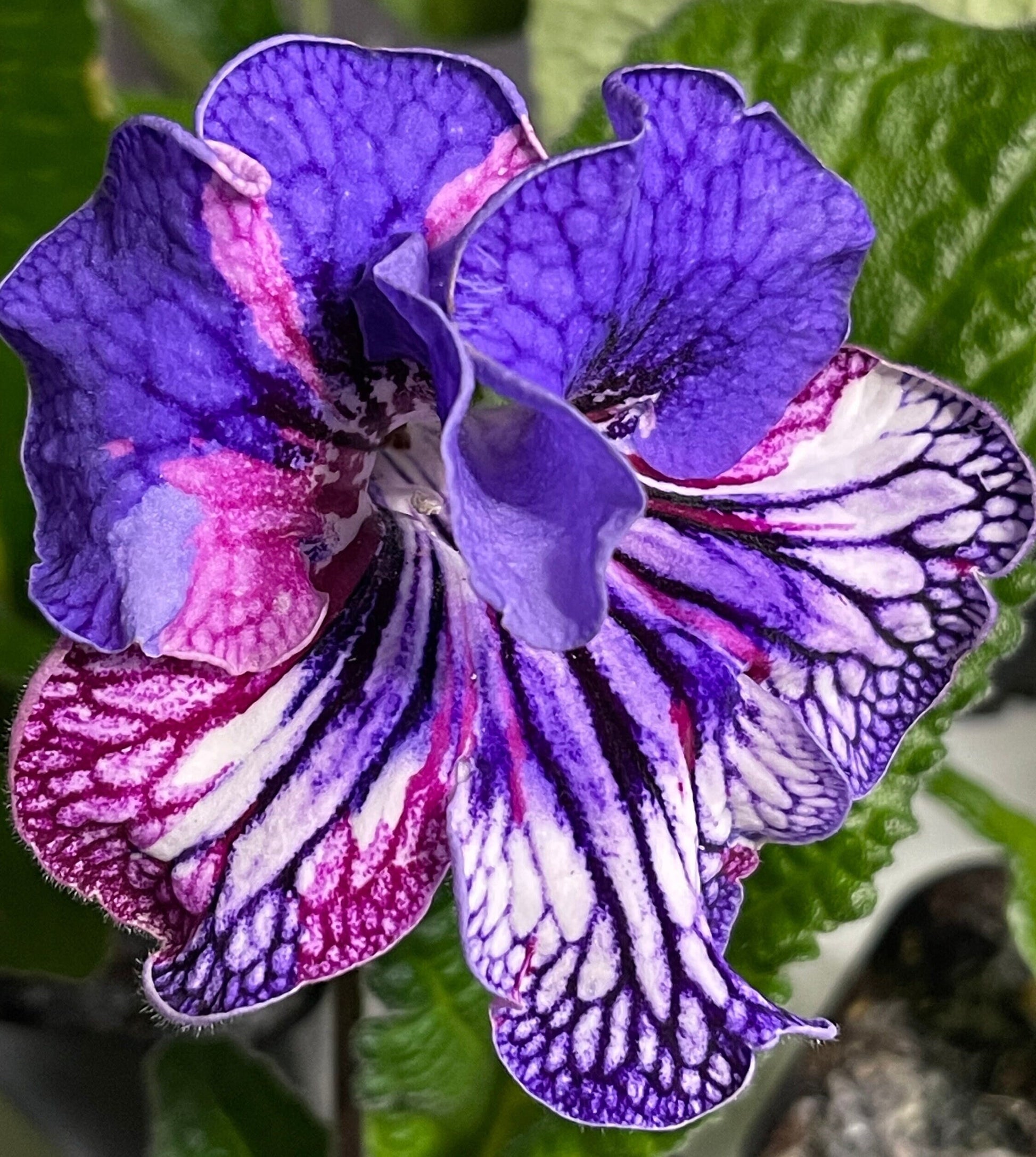 Streptocarpus Rays of Hope, WOW! This new variety is wild with color. Each new bloom is slightly different than the last. It always has the same colors, just arranged in other patterns. Large flowers with Ruffled edges.