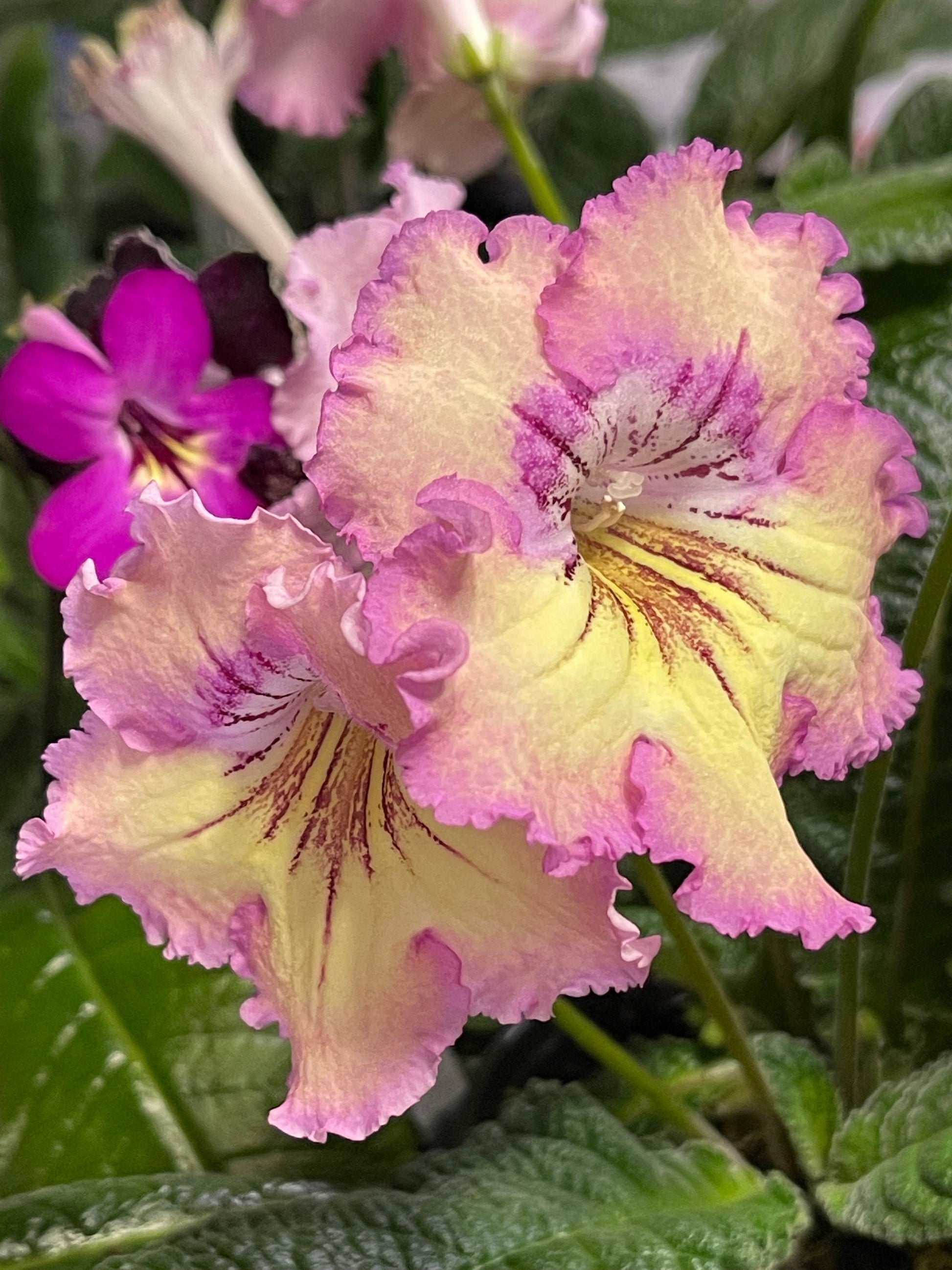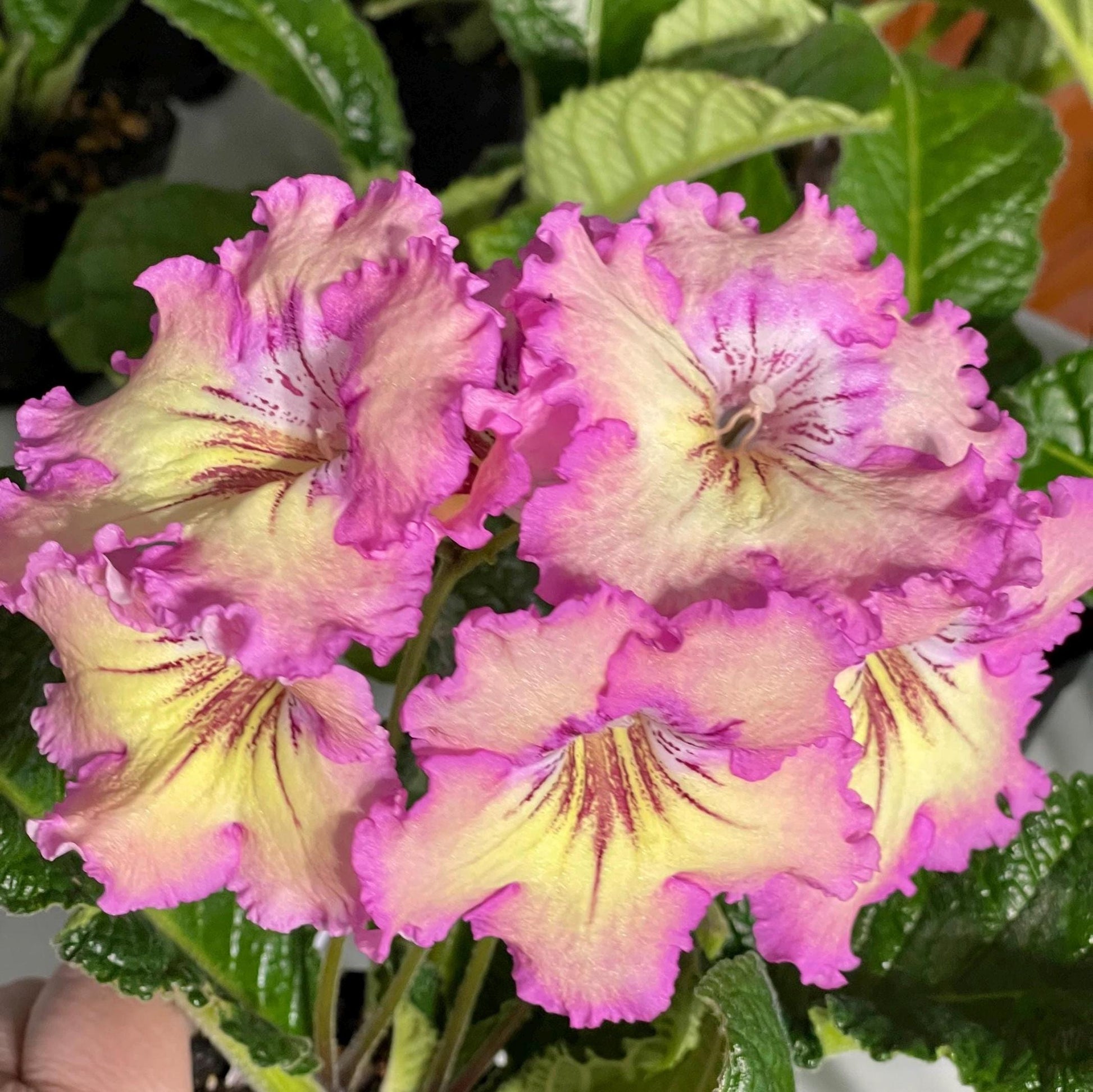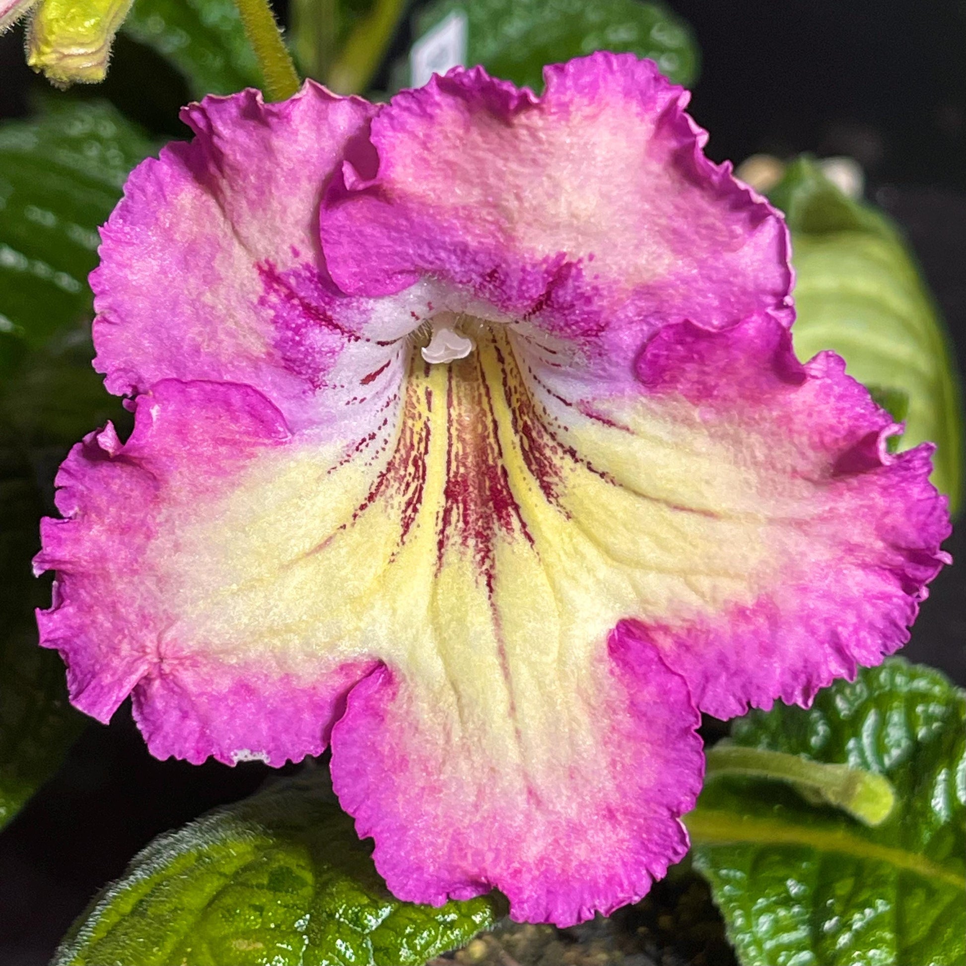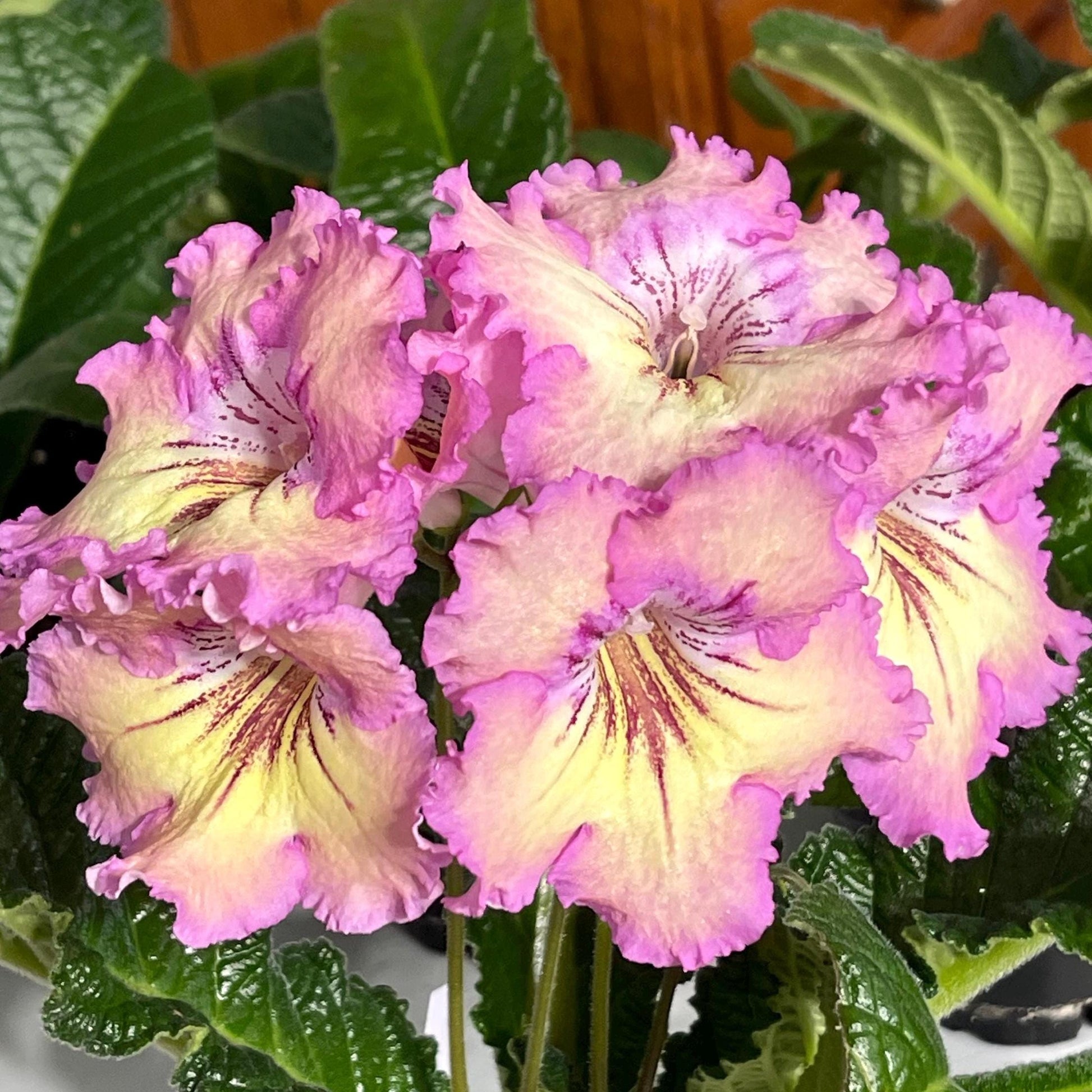 Rays of Sunshine has large yellow flowers with soft rose pink edging. Dark burgundy red rays extend from the throat. Frilly ruffled edges. Stunning in bloom!