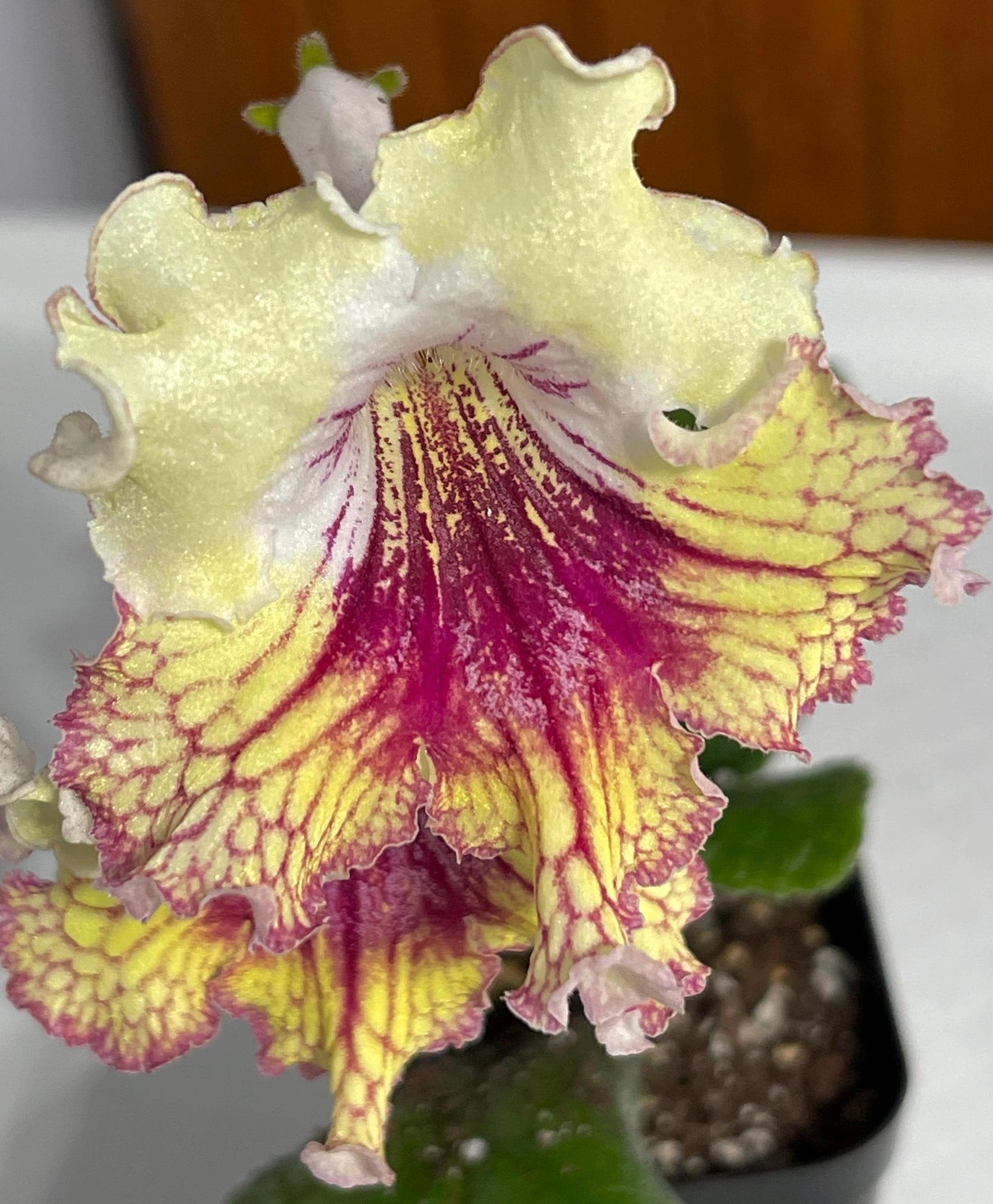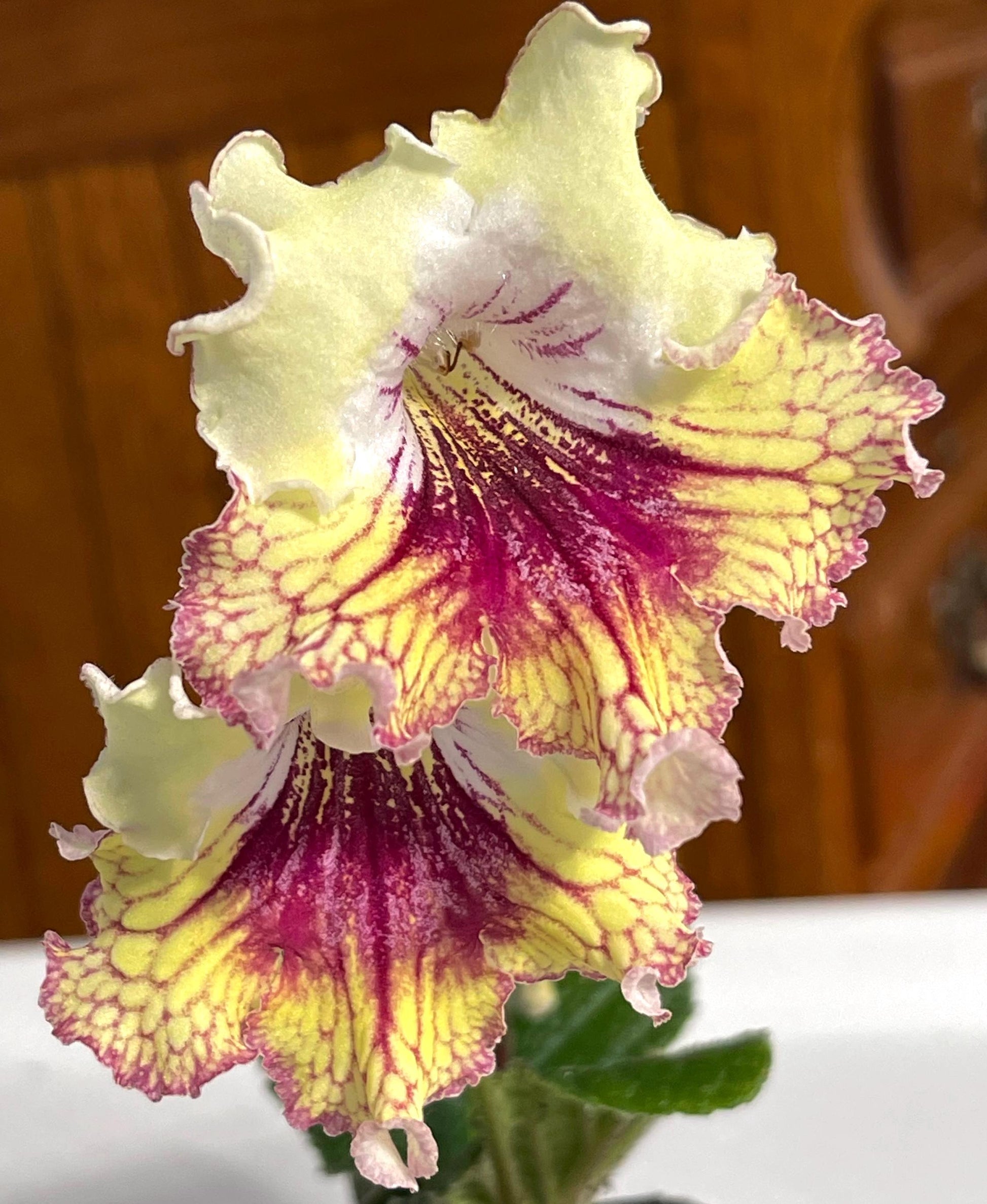 Sizzler has soft yellow flowers, darker on the lower lobes. White center with red patch and netting on the lower lobes.