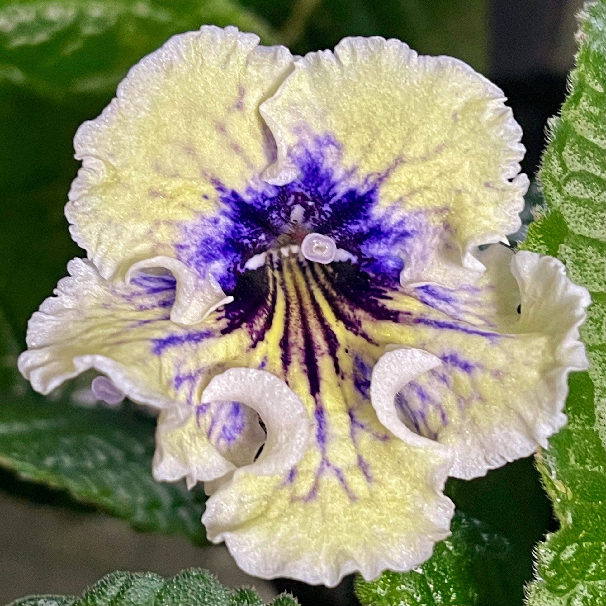 UA Solar Eclipse has light yellow flowers with a purple eye, and pale crimped edges.