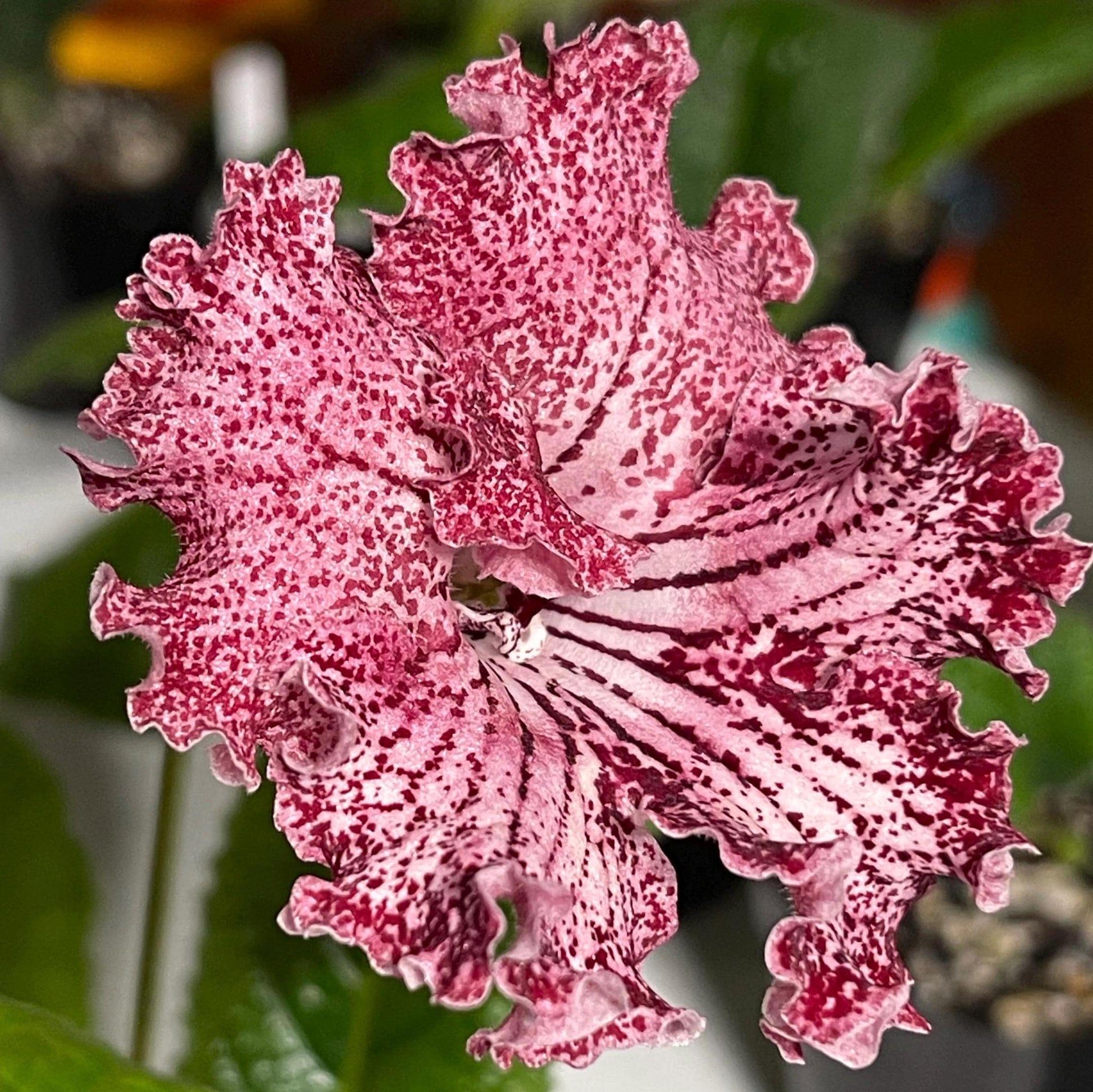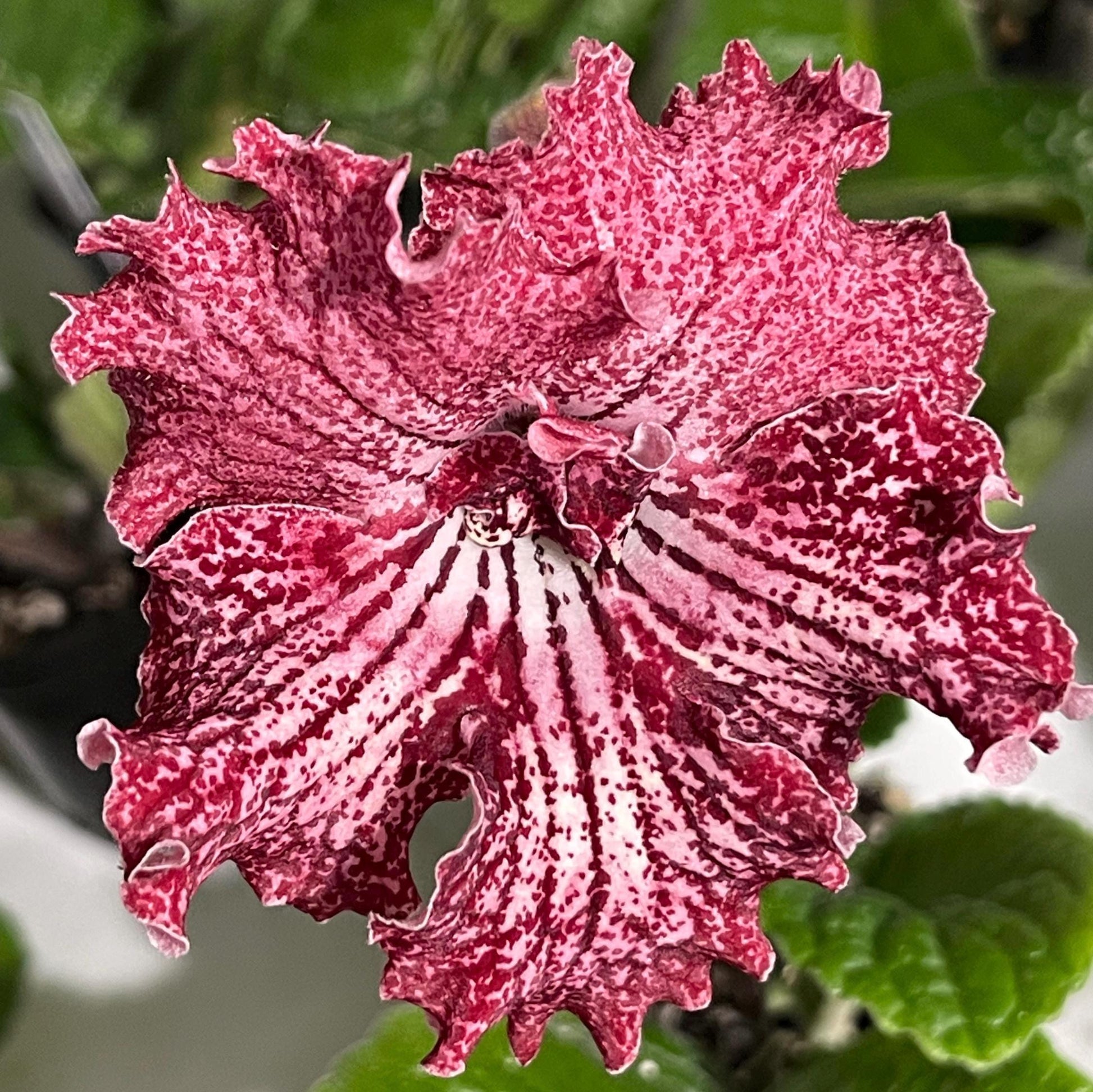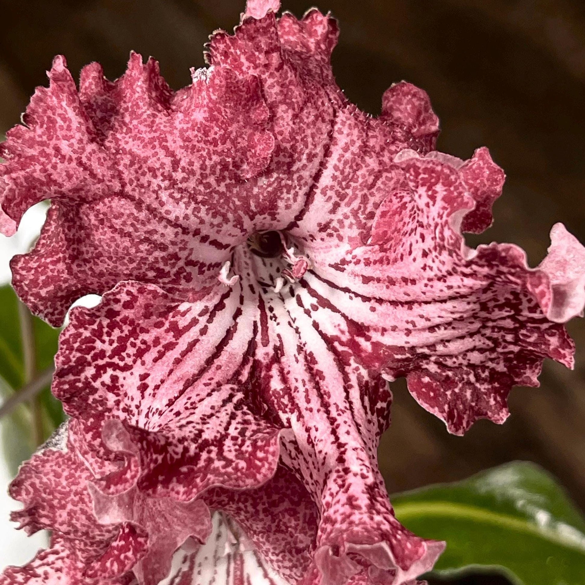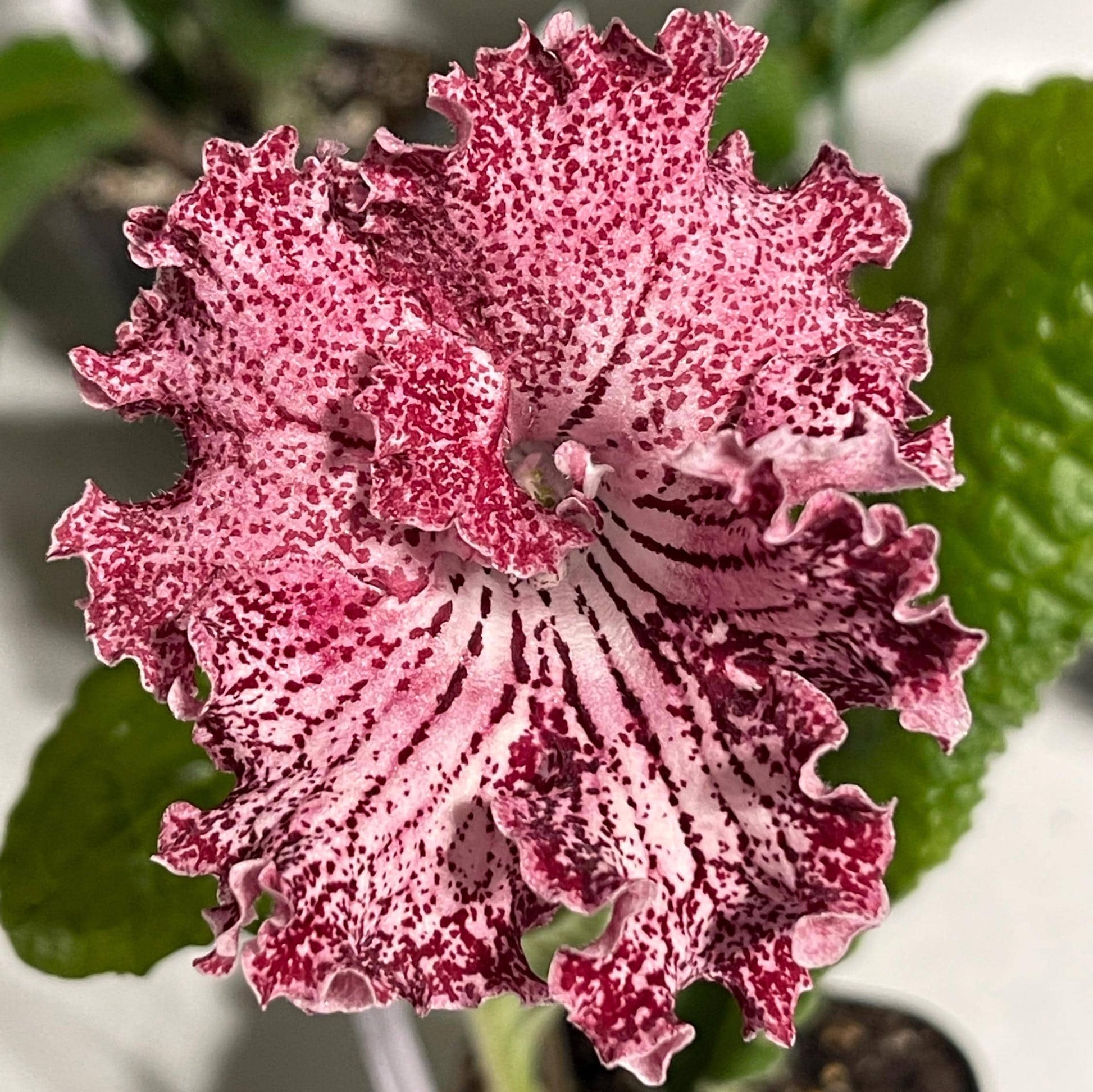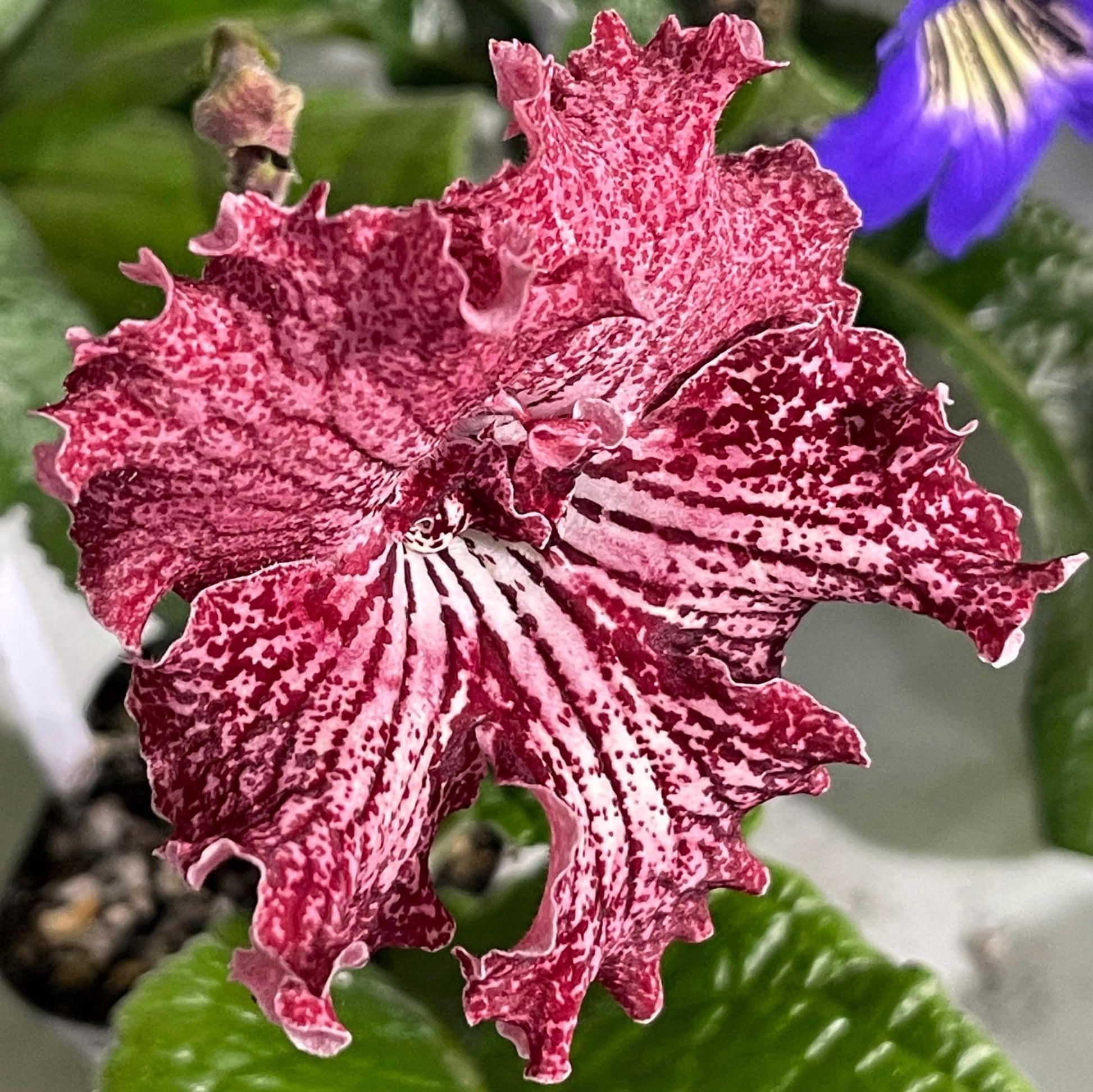 UA Valley of Elves, bred in Ukraine, has gorgeous blooms with ruffled edges. Upper lobes are pink, heavily netted in red. Lower lobes are a cream color with dark red netting and speckles, getting more red on the very edges. As with all streptocarpus, color will be variable depending on light, temperature and age of the bloom.