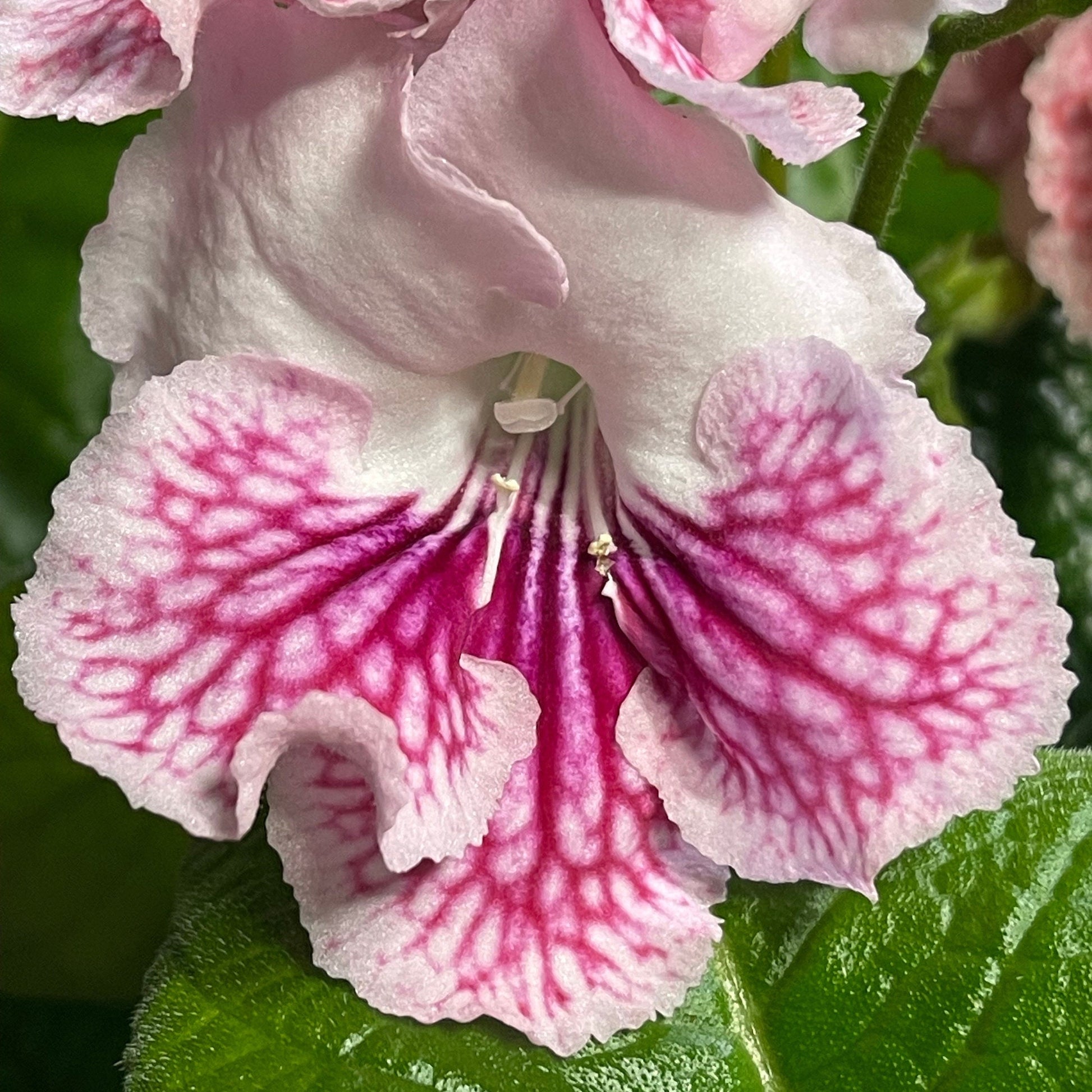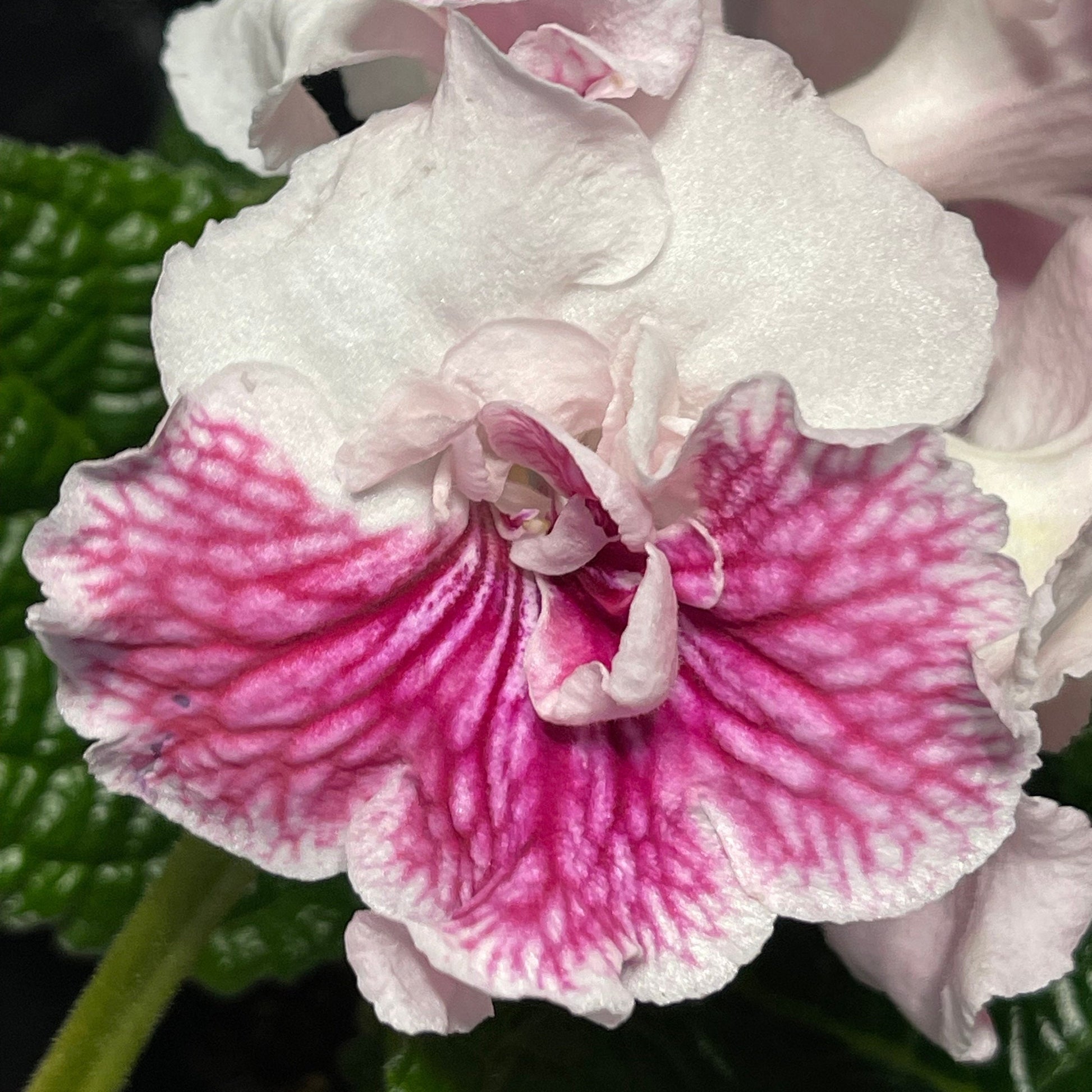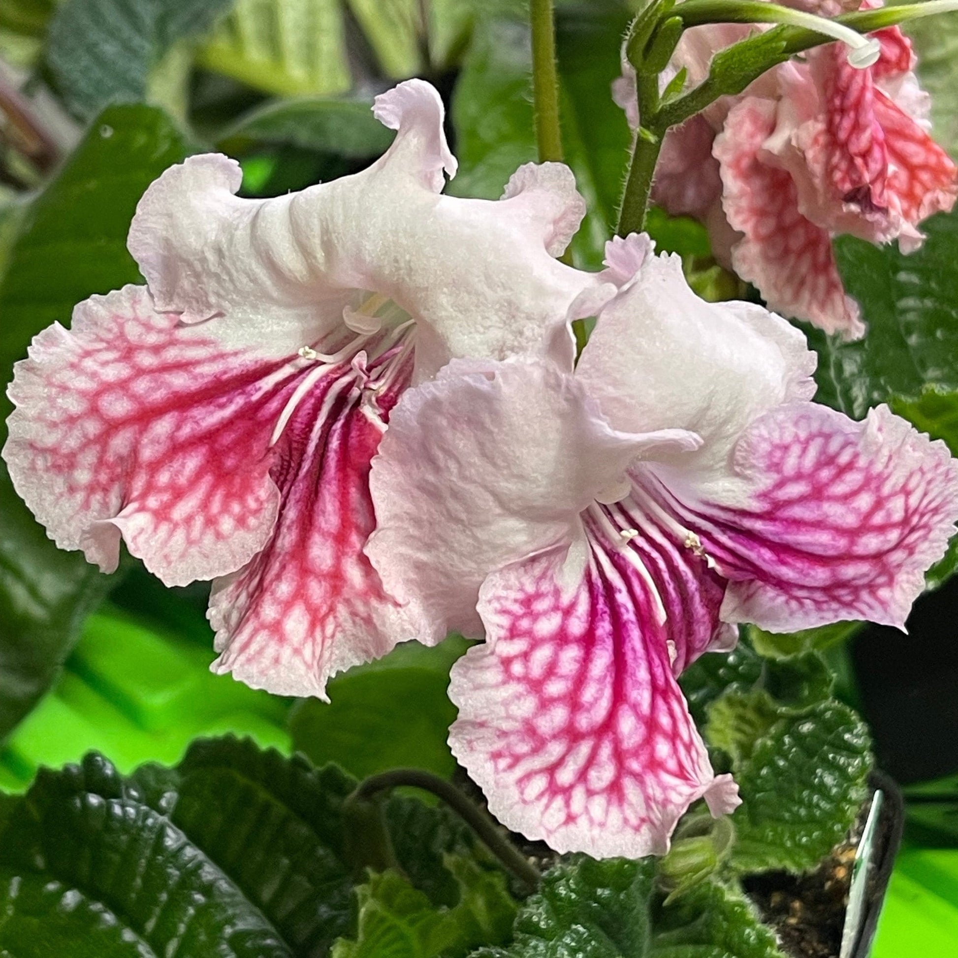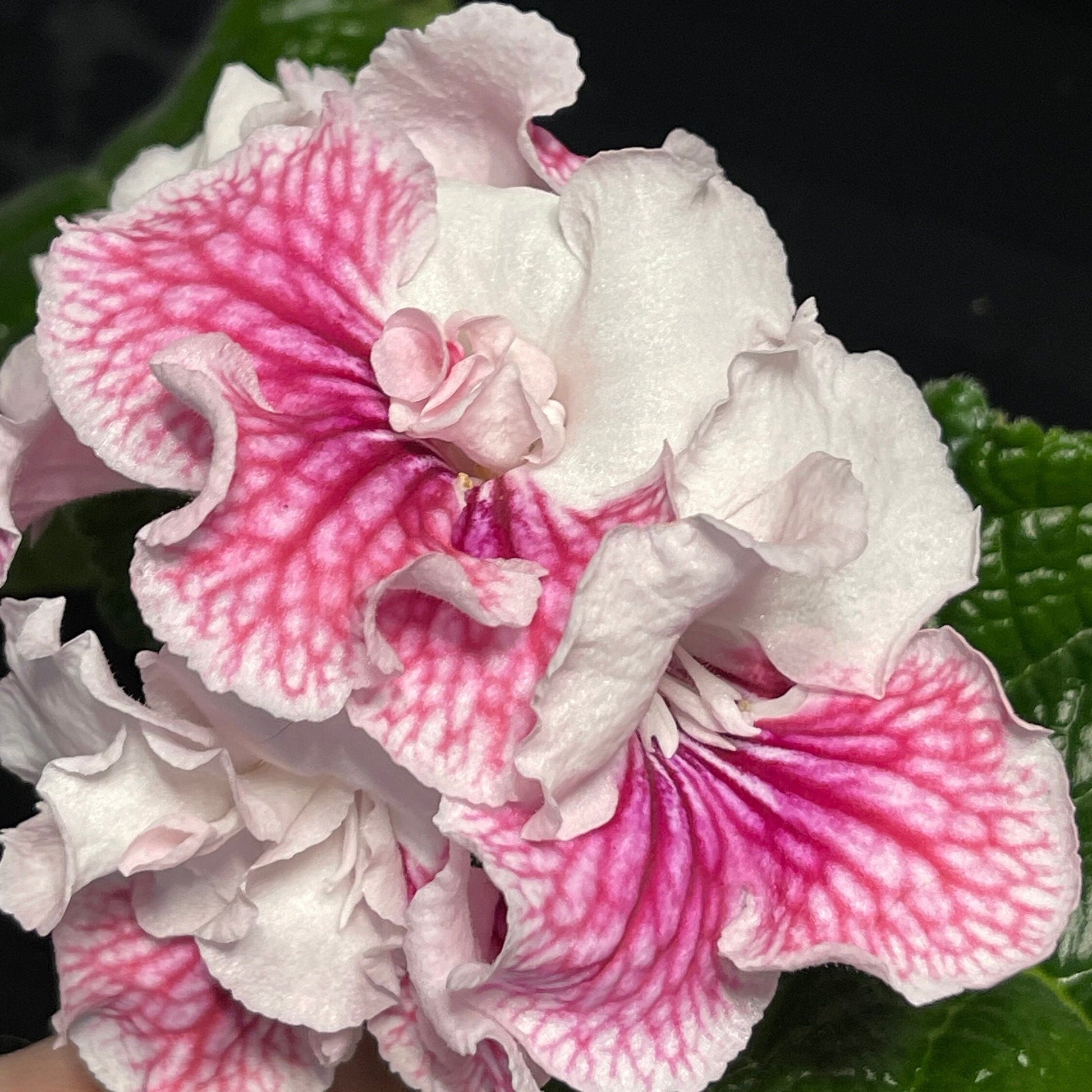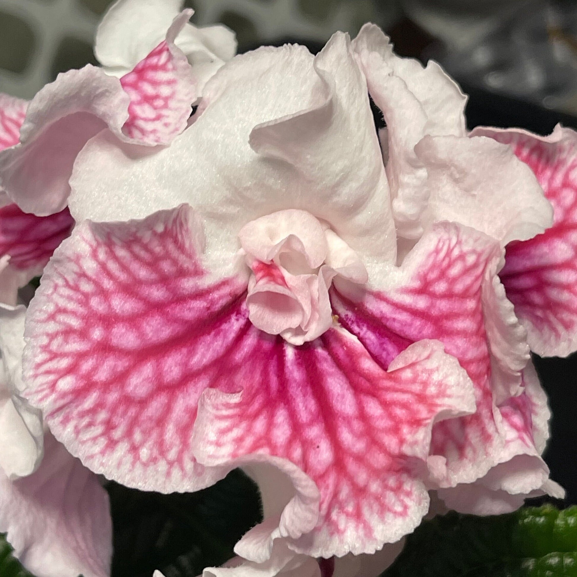 VaT Mandarinka, bred by Tatiana Valkova, forms large white, single to double blooms. Purple veins streak from the throat when the flower opens, gradually changing to red as it ages. Both colors will show on the plant at the same time.